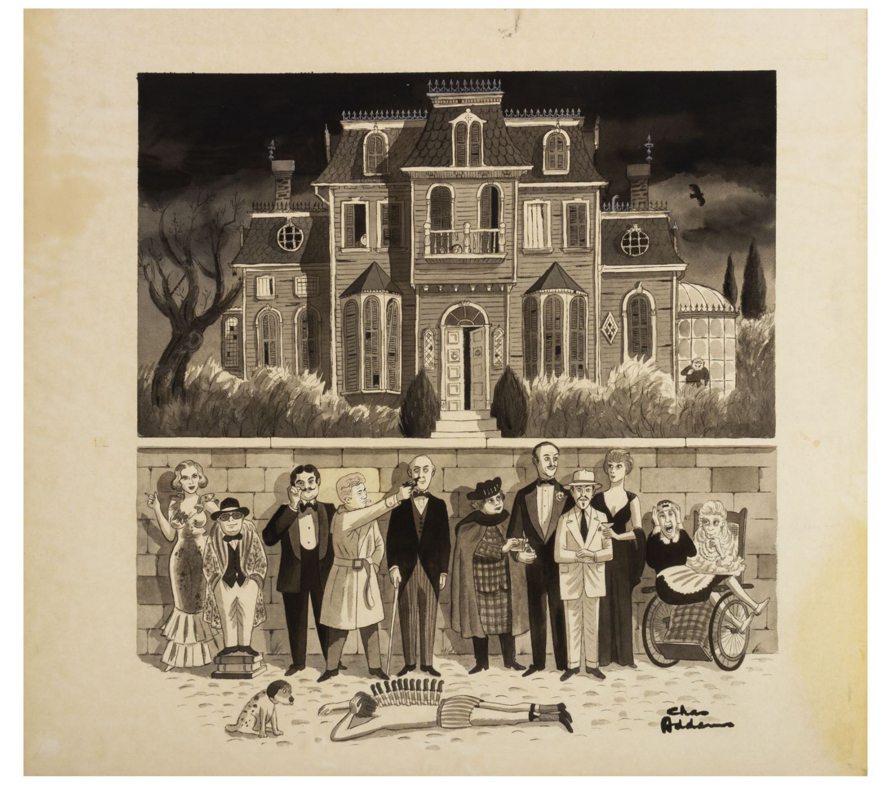 (Columbia, 1976) A rare large original painting created by renowned cartoonist Charles Addams for the 1976 feature film "Murder by Death". Addams is well known for his dark humor and macabre characters including the “Addams Family”, which became the basis for several movies and TV shows. The artwork depicts Addams’ stylish renditions of the principal members of the cast including Eileen Brennan, Truman Capote, James Coco, Peter Falk, Alec Guinness, Elsa Lanchester, David Niven, Peter Sellers, Maggie Smith, Nancy Walker, and Estelle Winwood, as well as a very “Addams Family” style background. Accomplished in ink and gouache on art board, this illustration measures an impressive 24.5"x27", which is a larger format than most of Addams’ known work, and is the largest painting by Addams we have seen offered for public sale. In addition to being used for the theatrical release poster, the artwork was integrated into promotional materials as well as the iconic opening title sequence of the film. The painting in very good condition with some wear around the edges from use. Interestingly, Addams had difficulty in creating the likeness of Peter Falk as Detective Sam Diamond. As seen in this final artwork, there is a new head that was created, trimmed, and applied on top of the underlying original head. The artwork is signed by Addams at the lower-right.