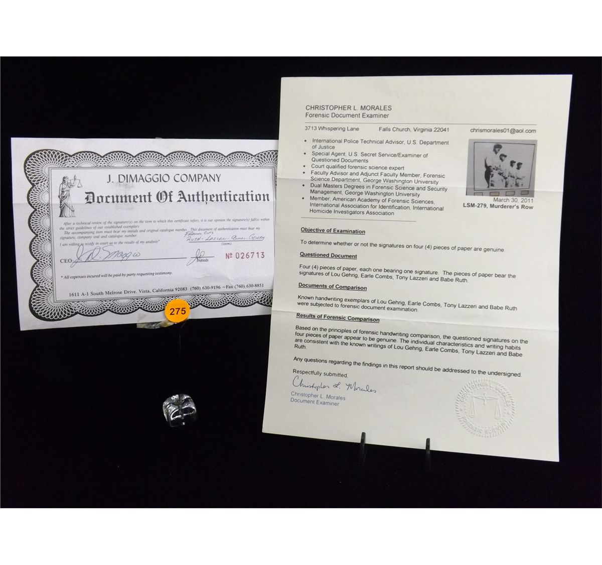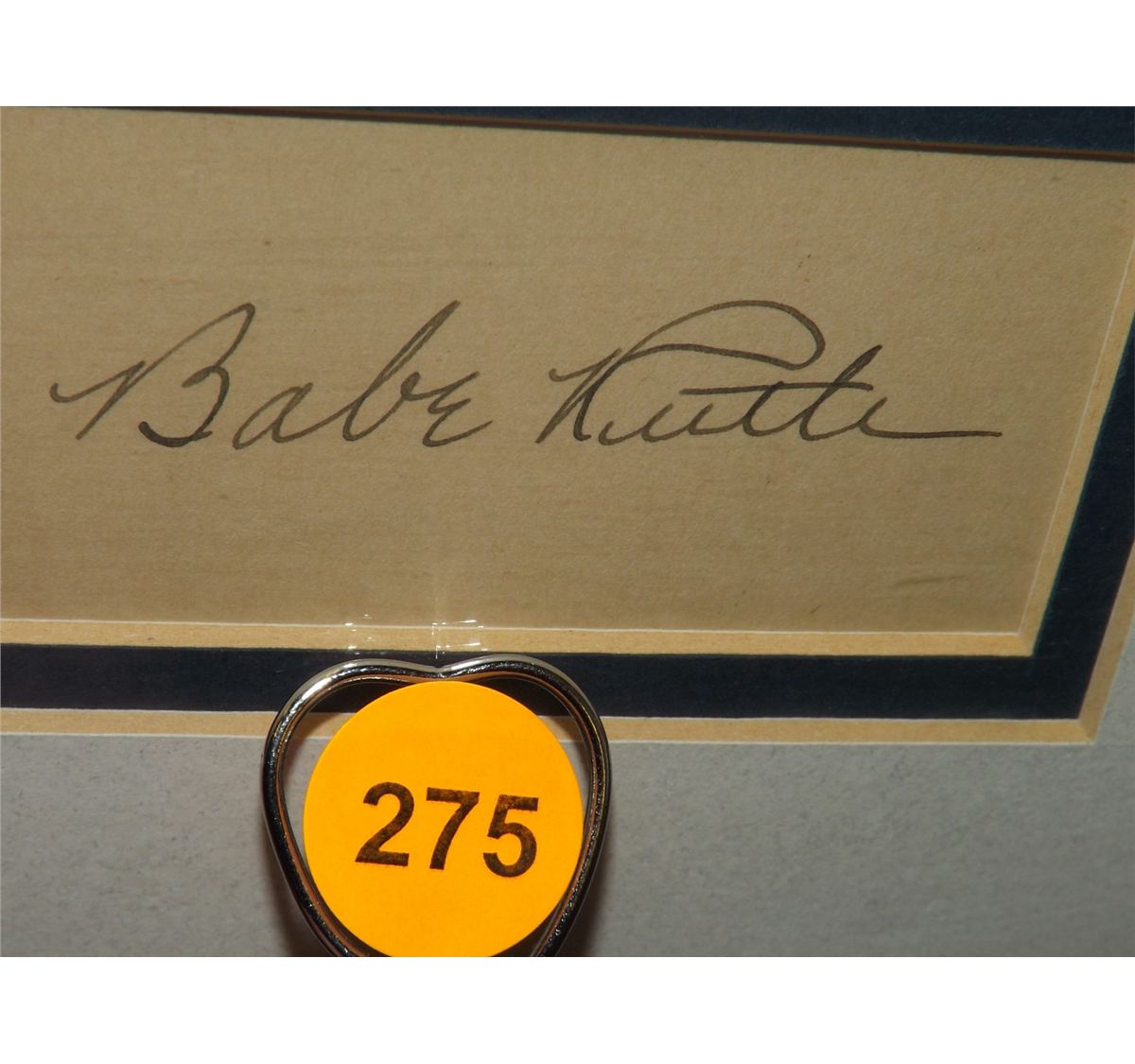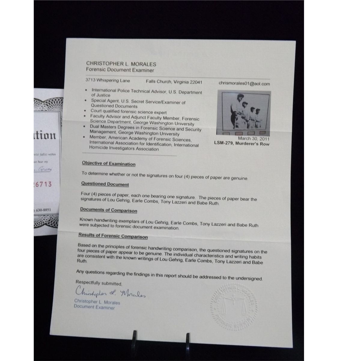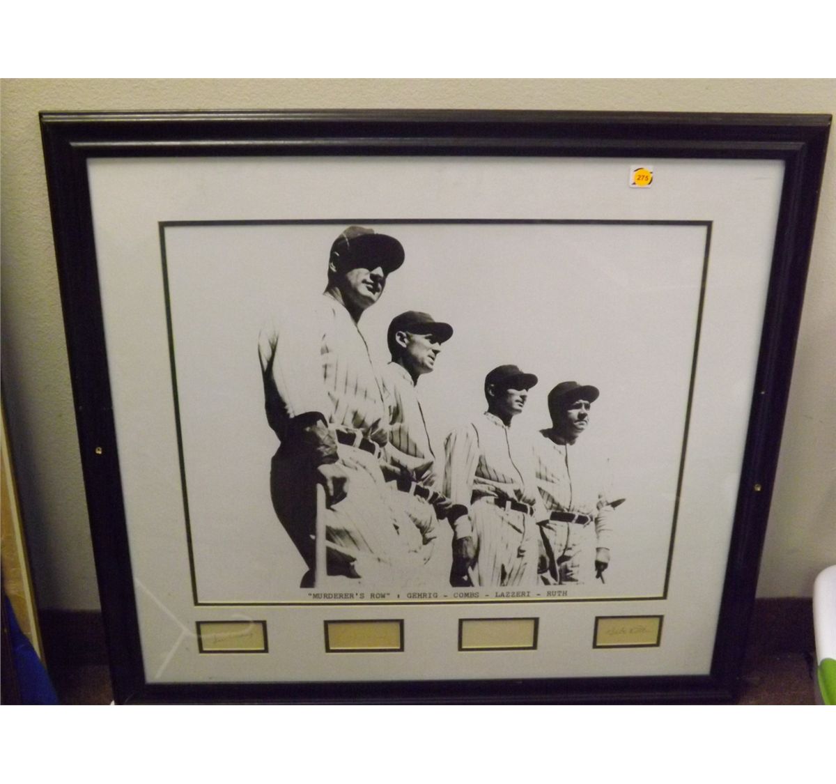 Murders Row Photo with Seperate Autographs. 33x31 Framed Photo with Die Cut autographs of Lou Gehrig, Earle Combs, Tony Lazzari and Babe Ruth. Appraised or estimated retail value $12,000. COAs by Christopher Morales and J. DiMaggio Co. All Sales Final. Please see terms and conditions of auction.