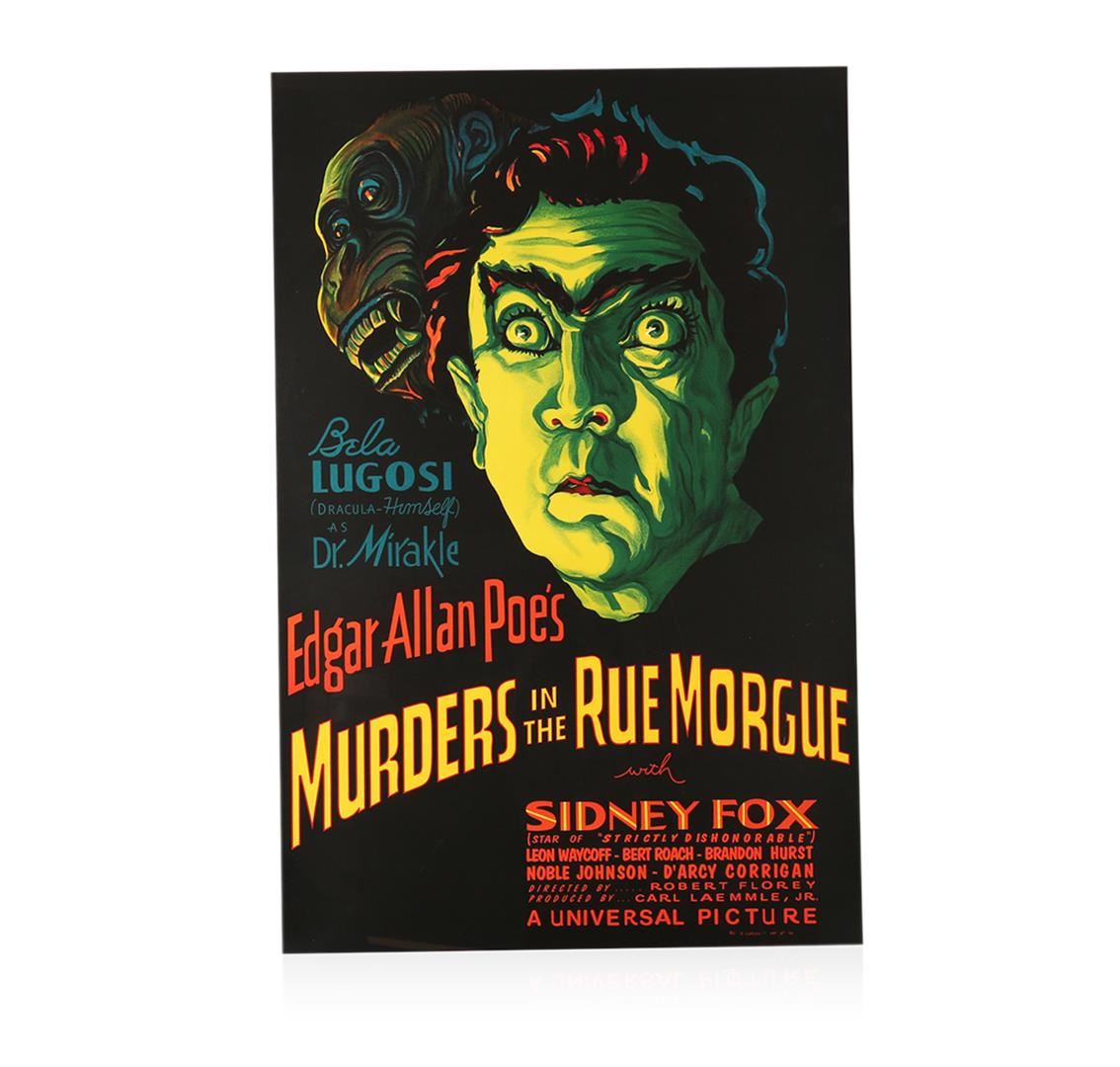 Lithograph hand pulled on Rives 100% cotton paper. Artist: Karoly Grosz. The vintage one-sheet was originally created in 1932 for Murder in the Rue Morgue, starring Bela Lugosi. This one-sheet is one of the S2 Art Group's recreated posters in affiliation with the American Film Institute's "100 American Classic Movie Posters", in 2000. This is a lithograph recreated on a 19th century vintage hand-pulled press. It comes with a certificate of authenticity. Size: 27" x 41"
