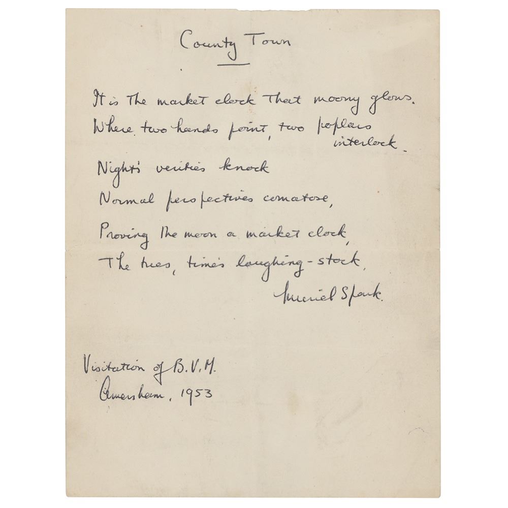 Handwritten poem signed "Muriel Spark," one page, 5.25 x 7, dated, "Visitation of B.V.M., Amersham, 1953." Spark writes a poem entitled "County Town," in full: "It is the market clock that moony glows / Where two hands point, two poplars interlock / Night's verities knock / Normal perspectives comatose, / Proving the moon a market clock, / The trees, time's laughing-stock." In very good to fine condition, with intersecting folds, light creasing, and a paperclip impression to the top edge.