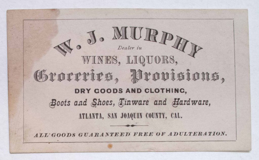 W.J. Murphy was a dealer in wines, liquors, groceries, provisions, dry goods and clothing--boots and Shoes, Tinware and Hardware. "All Goods Guaranteed Free of Adulteration." printed at bottom of the card. 2 x 4."City: AtlantaCounty: San Joaquin CountyState: CA