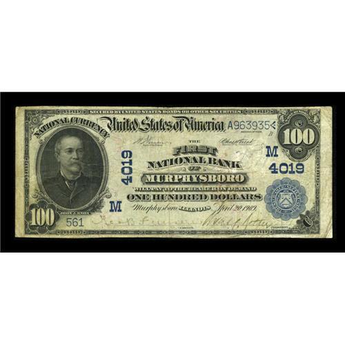 <B>Murphysboro, IL</B></I> - $100 1902 Date Back Fr. 691 <B>The First NB</B></I> Ch. # (M)4019<BR>Pen signatures are still visible on this crisp <B>Very Good-Fine</B></I> note which has toned a touch. This is the only known example for its type.<BR><I>From The Lincoln Collection</B></I><BR><BR><b>Shipping:</b> Coins & Currency (<a target="_blank" href="http://www.heritageauctions.com/common/shipping.php">view shipping information</a>)