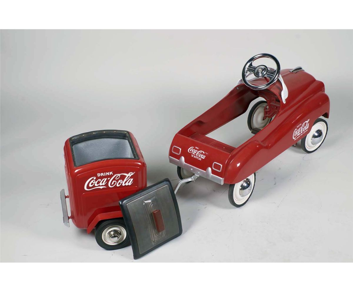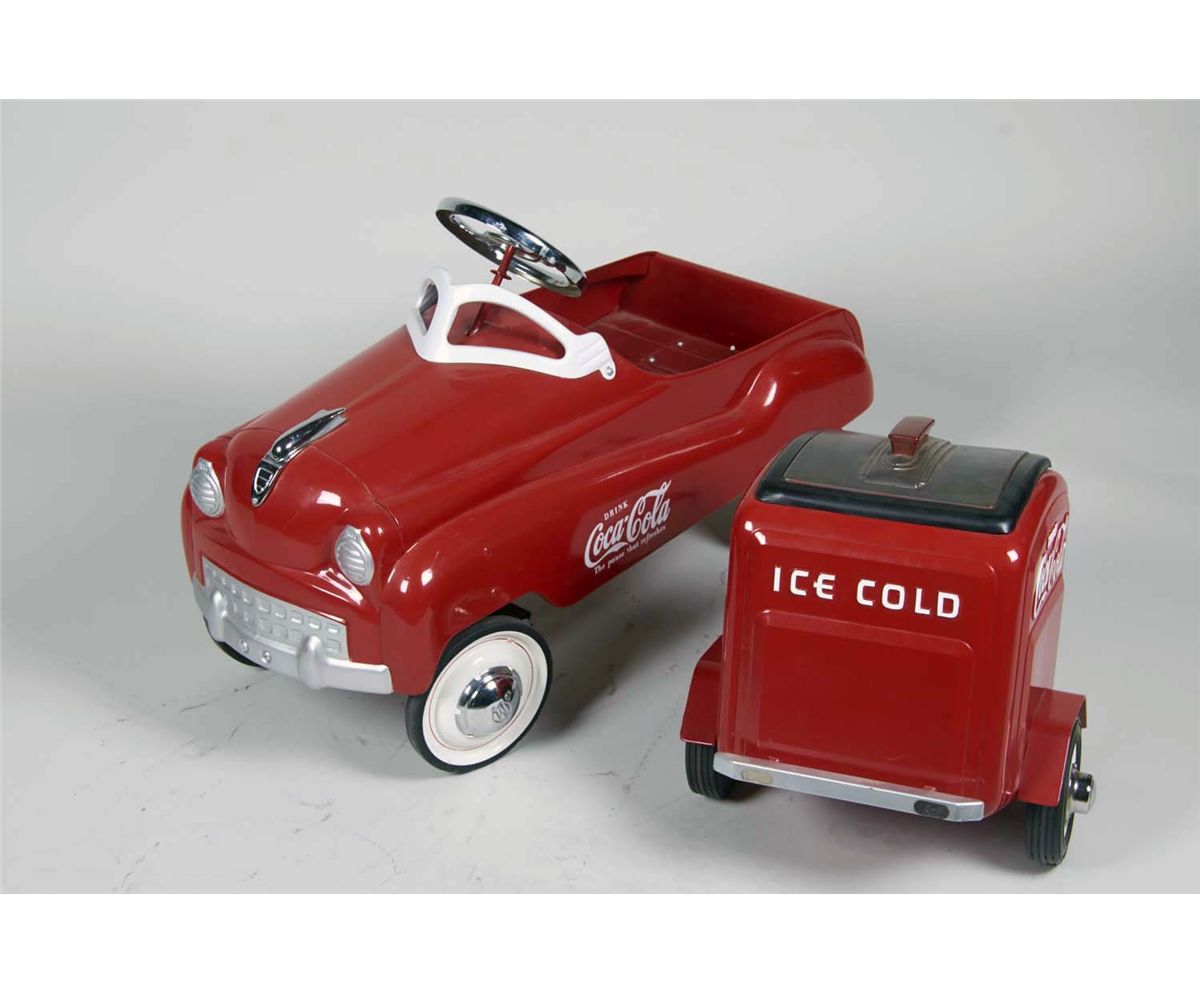 Pedal car restored in Coca Cola motif with "M" hub caps. Includes restored vintage Coke ice cooler made into a small trailer. Contemporary design. Condition (Restored). Size 14" x 21" x 35"