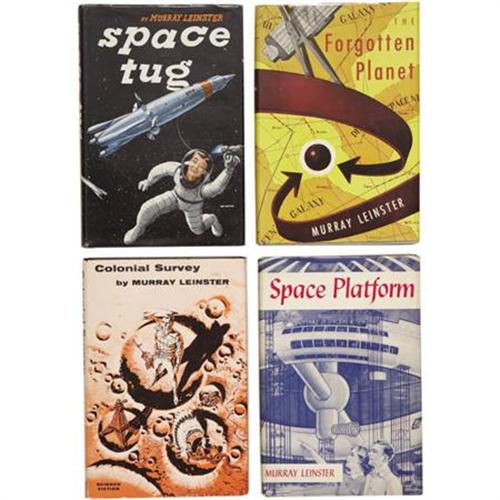 <B>Murray Leinster [pseudonym of Will F. Jenkins]</B></I>. <B>Four First Editions, Two Signed</B></I>, including: <B><I>Space Platform</B></I></B></I>. Chicago: Shasta Publishers [1953]. Front endpaper signed "'Murray Leinster' / Will F. Jenkins<I>.</B></I>"<I> </B></I>Octavo. 223 pages. Orange cloth with white and black spine titles. Dust jacket with minor paper loss at head of spine. Overall near fine. [and:] <B><I>Space Tug</B></I></B></I>. Chicago: Shasta Publishers [1953]. Front endpaper signed "'Murray Leinster' / Will F. Jenkins." Octavo. Blue cloth with white and blue titles. Overall fine condition. [and:] <B><I>The Forgotten Planet</B></I></B></I>. New York: Gnome Press, Inc. [1954]. Octavo. 177 pages. Gray cloth with red spine titles. Overall fine condition. [and:] <B><I>Colonial Survey</B></I></B></I>. New York: Gnome Press [1957]. Octavo. 185 pages. Black cloth with red spine titles. Some toning in paper. Overall fine condition. <I>From the Robert and Diane Yaspan Collection.</B></I><BR><BR><b>Shipping:</b> Books & Catalogs (<a target="_blank" href="http://www.heritageauctions.com/common/shipping.php">view shipping information</a>)