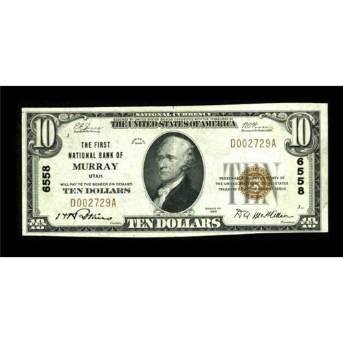 <B>Murray, UT</B></I> - $10 1929 Ty. 1 <B>The First NB</B></I> Ch. # 6558<BR> This high grade example is one of the few really nice notes reported from this otherwise not exceptionally scarce bank. <B>Extremely Fine.</B></I><BR><BR><b>Shipping:</b> Coins & Currency (<a target="_blank" href="http://www.heritageauctions.com/common/shipping.php">view shipping information</a>)