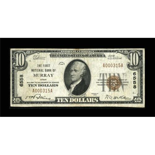 <B>Murray, UT</B></I> - $10 1929 Ty. 1 <B>The First NB</B></I> Ch. # 6558<BR> An attractive and original Utah issue. <B>Fine.</B></I><BR><BR><b>Shipping:</b> Coins & Currency (<a target="_blank" href="http://www.heritageauctions.com/common/shipping.php">view shipping information</a>)