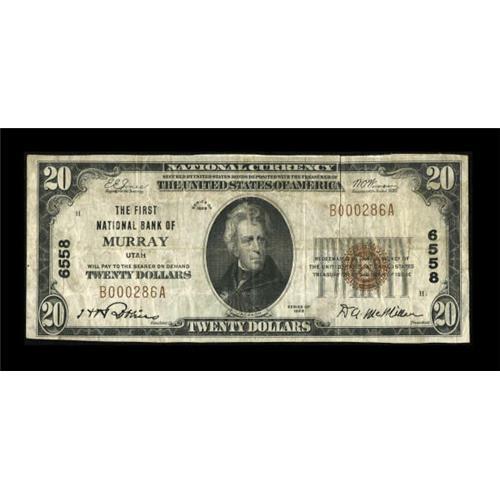 <B>Murray, UT</B></I> - $20 1929 Ty. 1 <B>The First NB</B></I> Ch. # 6558<BR> A perfectly original piece from this one bank town. <B>Fine.</B></I><BR><I>From The Kansas City Collection.</B></I><BR><BR><b>Shipping:</b> Coins & Currency (<a target="_blank" href="http://www.heritageauctions.com/common/shipping.php">view shipping information</a>)