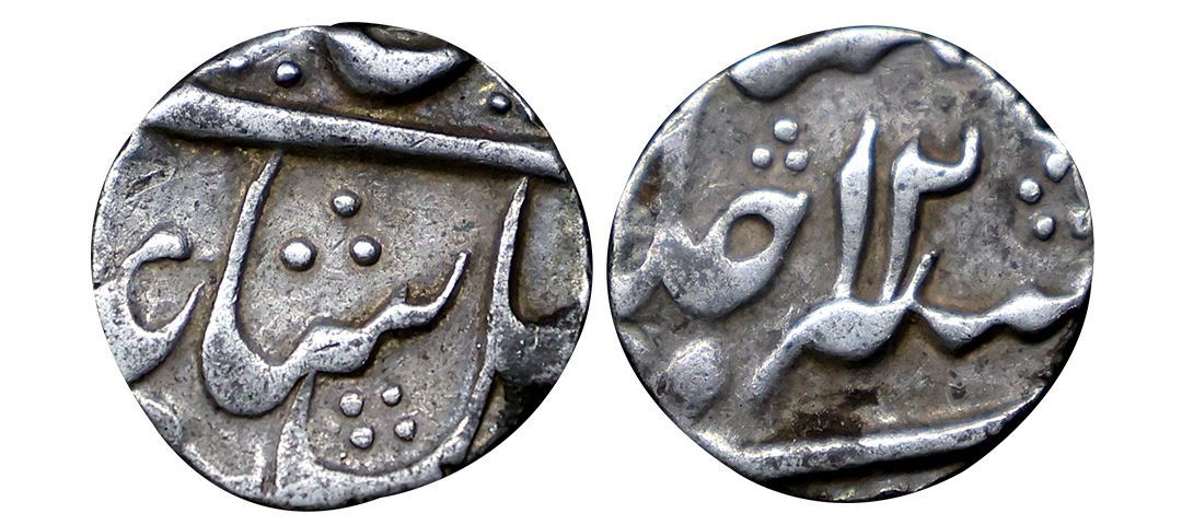 Murshidabad mint, silver ¼ rupee (4 anna) in the name of Shah Alam II, RY 12 with 4/3 dot combination, Stevens EIC 2.147, PR 124, 2.90g. About Very fine, Rare.