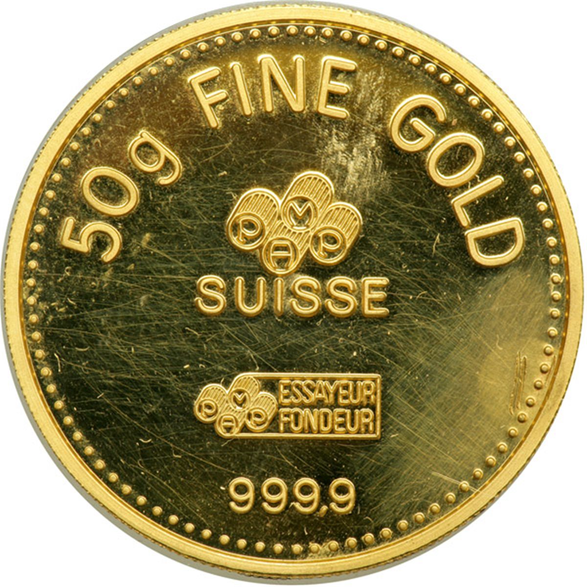 Muscat & Oman. Gold Round, AH1370 (1970). Said Bin Taimur, bust right. Reverse: 50 gram Fine Gold. Suisse. stamped 999.9 fine. In green case. Choice Brilliant Proof.