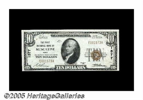<B>Muscatine, IA</B></I> - $10 1929 Ty. 1 <B>The First NB</B></I> Ch. # 1577<BR>This was the second of two titles used by this bank, with its 1929 emissions coming entirely under this nomenclature. <B>Choice Crisp Uncirculated,</B></I> and very close to Gem.