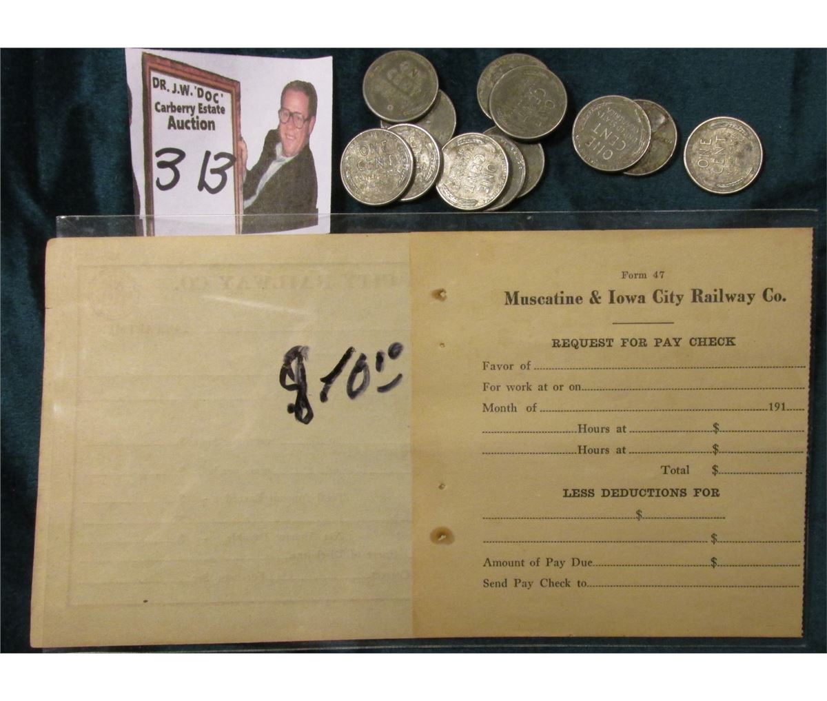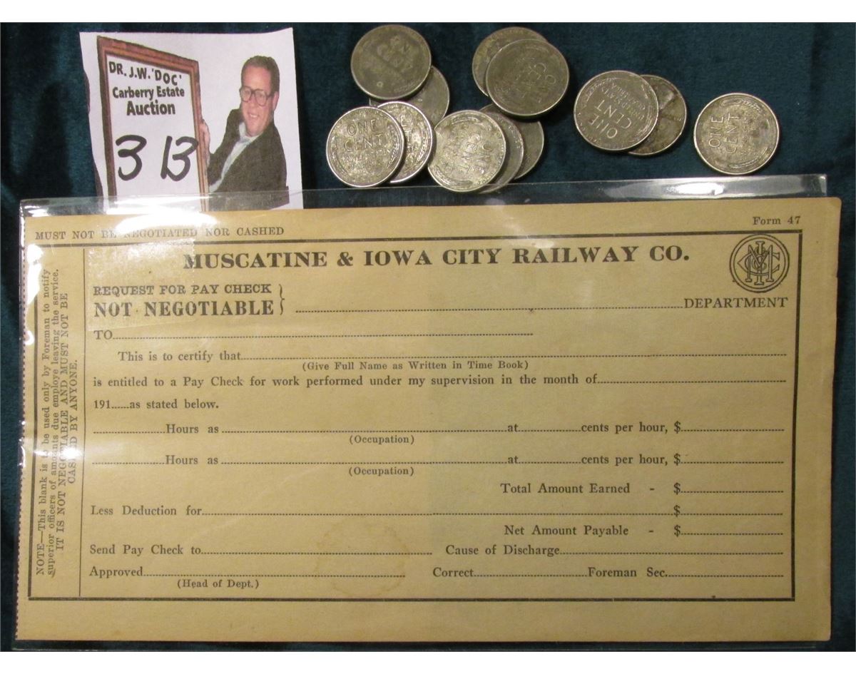 "Muscatine & Iowa City Railway Co. Request For Pay Check…" Unissued; & (12) various World War II 'Steel' Cents, circulated.