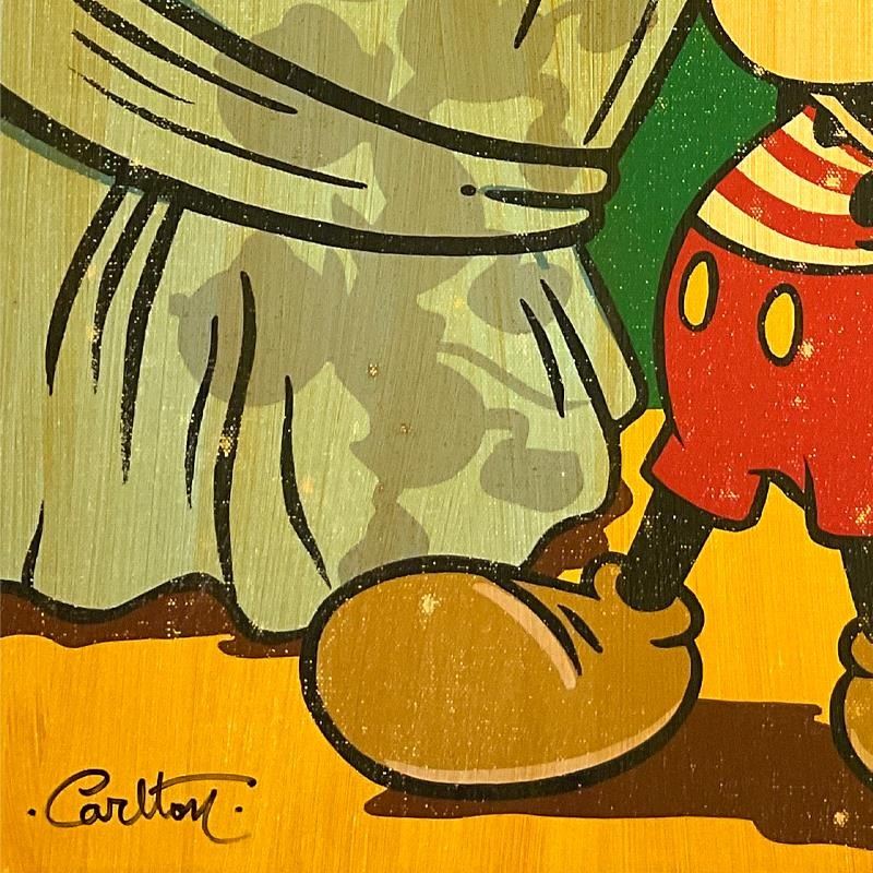 "Muscle Mickey" is a limited edition giclee on canvas by Trevor Carlton, numbered 14/195 and hand signed by the artist. This piece is licensed by Disney Fine Art and comes gallery wrapped. Includes Letter of Authenticity. Measures approx. 24" x 18" (image). ** Please note: there is a small crease on the top-left corner under the "M23". **