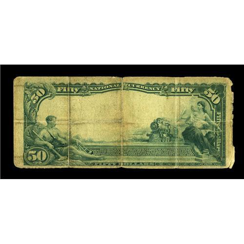 <B>Muscogee, OK</B></I> - $50 1902 Plain Back Fr. 678 <B>The First NB</B></I> Ch. # (W)4385<BR>This <B>Very Good</B></I> note bears the second of two titles under which this bank issued large size and the only one to bear this nomenclature for the $50 Plain Backs. A sharply folded <B>Very Good</B></I> with some margin roughness at left and rounded corners, this note may have been carried as a treasured wallet keepsake. It was sold by Lyn Knight at his 2000 Chicago Paper Money Expo auction for $148.50. Available once again, it will certainly sell for several multiples of its realization then.<BR><BR><b>Shipping:</b> Coin/Currency (<a target="_blank" href="http://www.heritageauctions.com/common/shipping.php">view shipping information</a>)