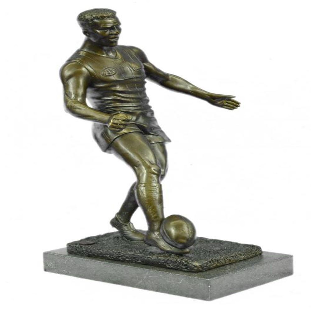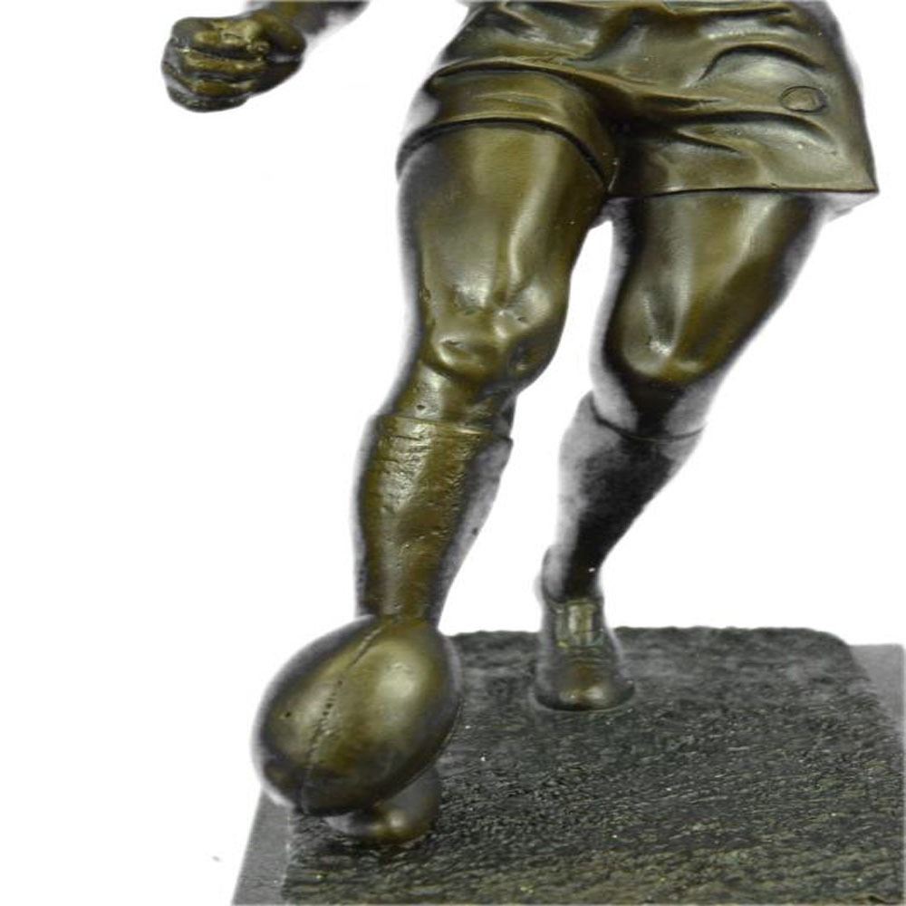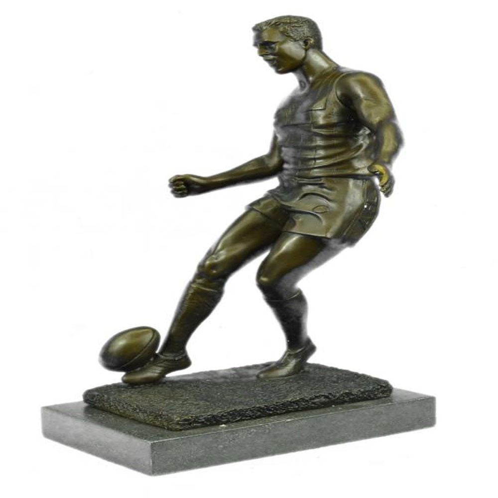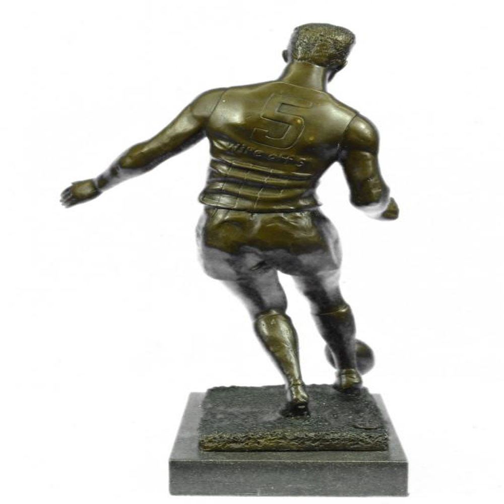 A muscular Rugby player runs for the end field, trying to skip the yards and avoid being tackled. His powerful legs ache as he sprints and dodges. He Kicked the ball under him protectively. Every once in a while he glances over his shoulder to see how close his opponents are. He eyes the white touch down line. He can hear another player barreling down on him. He glances at his teammate and prepares to hand the ball over, sacrificing himself for the win. This brown patina Sculpture was cast using the Lost Wax Method and mounted on a marble base. Dimensions: Height 15 X Width 8 inches. Weight: 10 LBS.