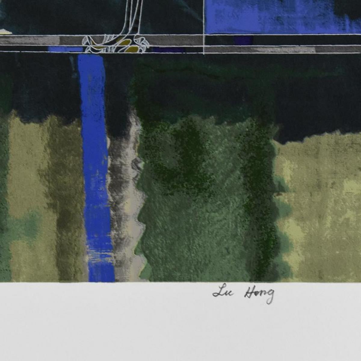 "Muse" is a limited edition serigraph on paper by Lu Hong, numbered and hand signed by the artist. Includes Letter of Authenticity. Measures approx. 34" x 38" (with border), 29" x 28" (image).
