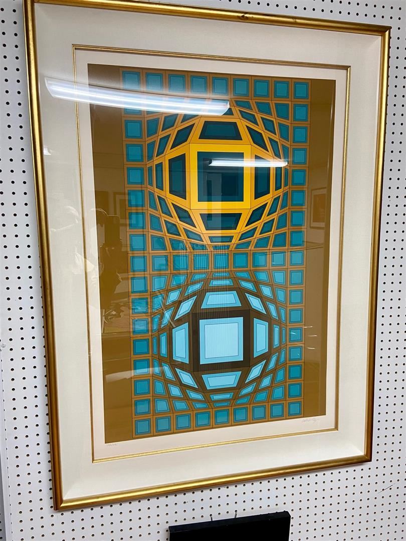 Modern Master Victor Vasarely breaks it down into cubist construction. A 48x35" framed serigraph 293/300. Frame as pictured shows some wear in the gold leafing. Sold AS IS.