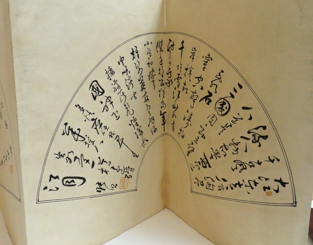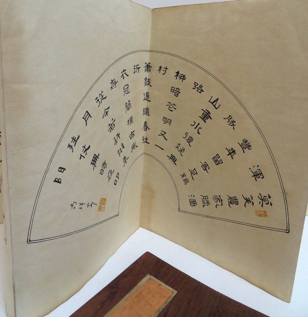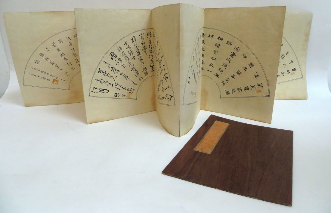 Four rice paper fan paintings on eight accordion pages, with a detached hard cover. Each fan painting is decorated with black ink calligraphy and red artist's stamps. Some staining. NO RESERVE! ! Most items in this sale have no reserve