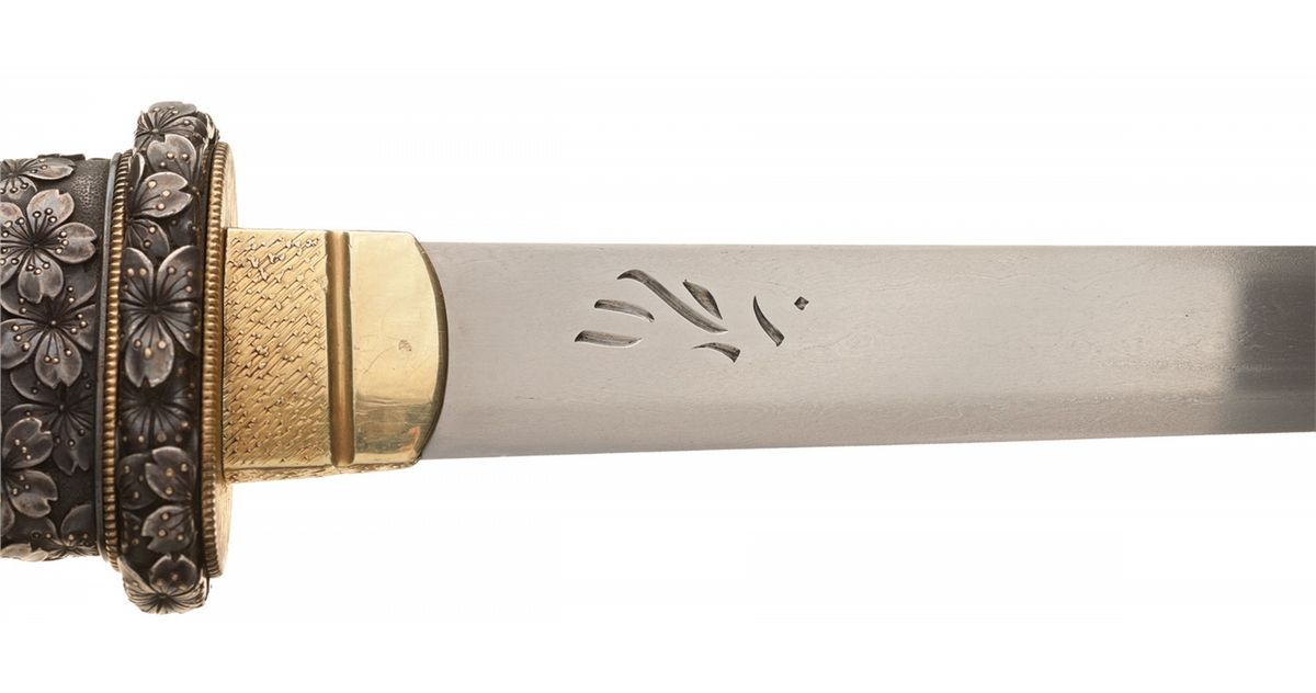 Very fine overall. A tiny chip is visible on the tip of the blade, which shows an excellent state of polish and a well defined temper line. A small amount of chipping and dents are visible on the lacquer, with a matching lacquered bronze panel installed at the kogai slot. The silver components are all finely aged, with superb detail. A superb piece in "as found" condition.