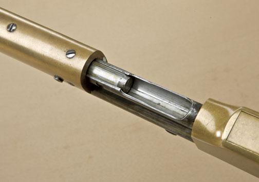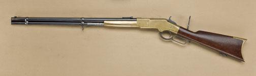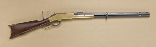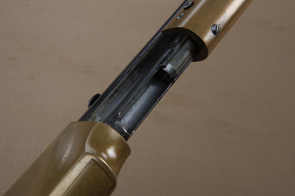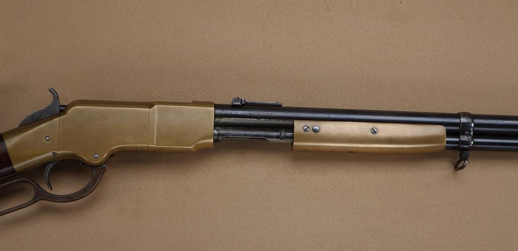 Museum quality Winchester Patent Model, improvement to the legendary Henry lever action rifle, .44 cal., 24” round barrel and loading tube, brass frame and sliding fore end, wood stocks, serial #8. This patentmodel exemplified the desired improvements to problems confronting the Henry rifle, namely elimination of the fragile forward loading gate and closing of the open slot in the lower area of the magazine tube; predecessorto the famous “yellow boy” Model 1866 rifle. This important historic Winchester is in overall excellent condition showing approx. 85% original blue finish to the barrel and loading tube with some scattered slight spots of erosion and pin prick pitting, beautiful rich taffy-colored patina to Henry style frame and sliding fore arm that when moved forward reveals the loading port on the underside of the enclosed tube at the frame;the bore is near mint and the interior of the receiver shows little if any use; the action is crisp; approx. 95% original case color remains on the hammer and there are strong traces of case color on the lever with the
