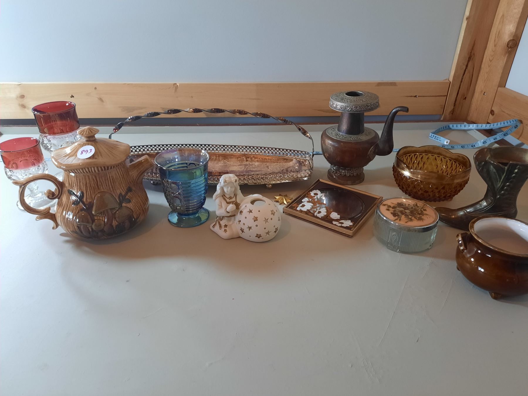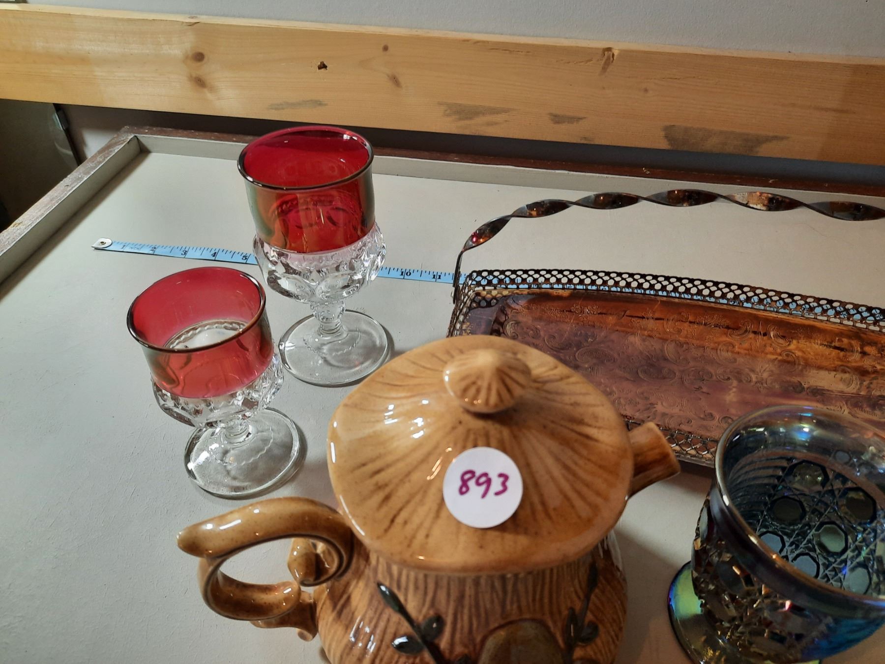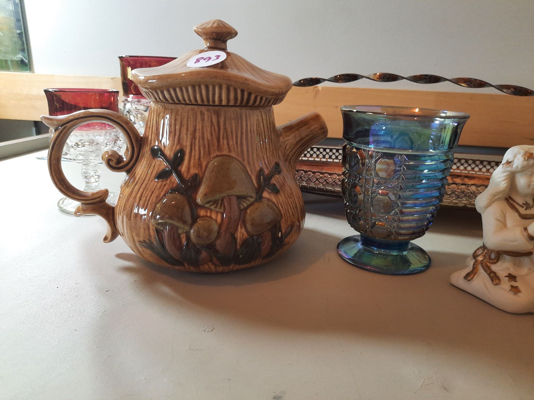 Mushroom Teapot, Brass Boot, Goblets, Dresser Jar, Small Decorative Mirror