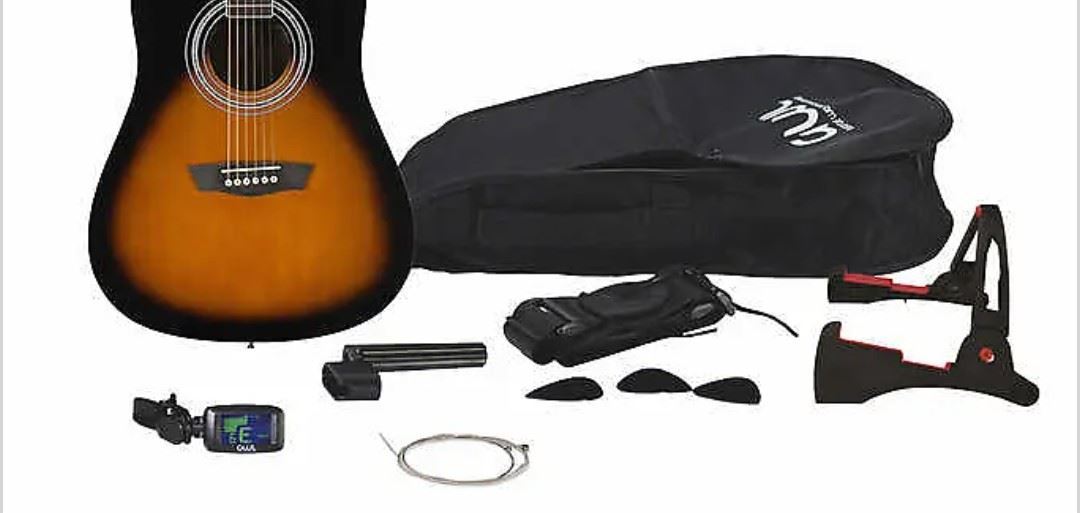 Full-size, sunburst finish guitar with carrying case, accessories include a tuner, capo, picks, strings, and a strap, new.