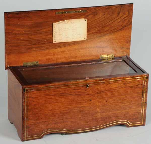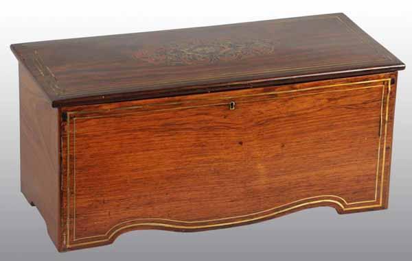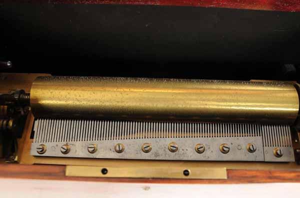 Description Twelve hidden bells, seven tunes and inlaid case. Working. Condition (Good). Size Cylinder: 14 - 1/4" L.