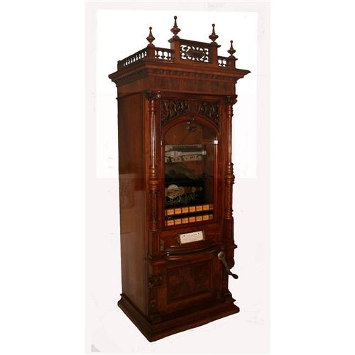 The Polyphon 24 ½" automatic disc changer is considered to be the premier musical box manufactured by the world famous firm, Polyphon Musikwerke of Leipzig, Germany. It is the largest of all Polyphon Changers. The12-disc changer operation is housed in a beautiful 101 cm x 73 cm x 241 cm tall walnut cabinet. It boasts an ornate cast bed plate. The housing for the disc storage compartment is decorated with brightly colored graphics depicting a factory. This machine features 159 notes on two combs, a full magazine of 24 ½" discs. It has evidently had a very pampered existence.