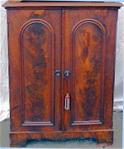 Music box stand in burl walnut with two doors with arched molding. Three drawers inside for disc storage plus large open area. Perfect fit for 15 ½" music box. Measures approximately 21" x 25" x 34" H.