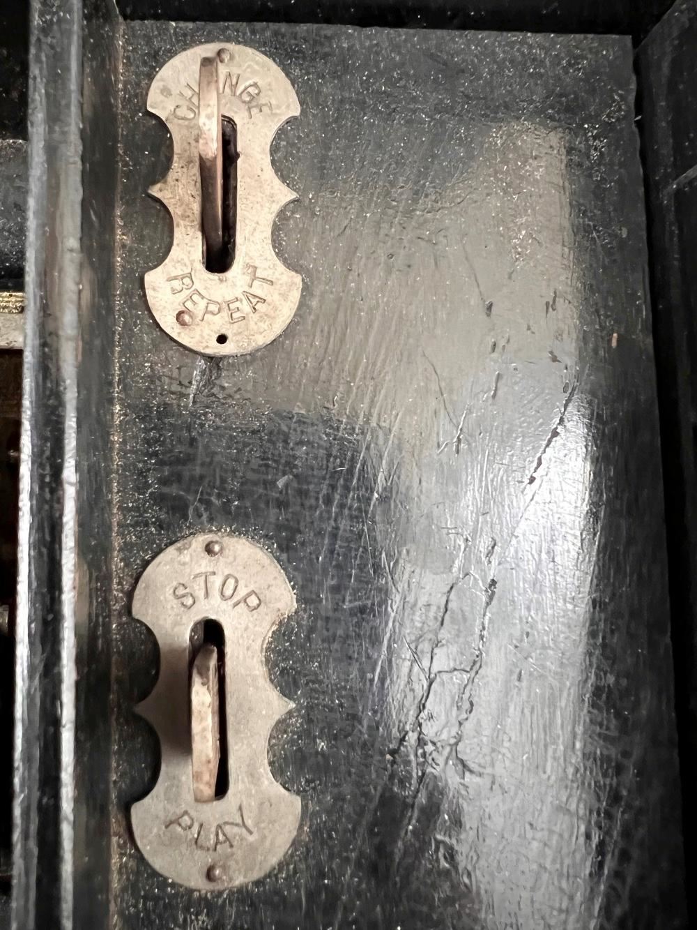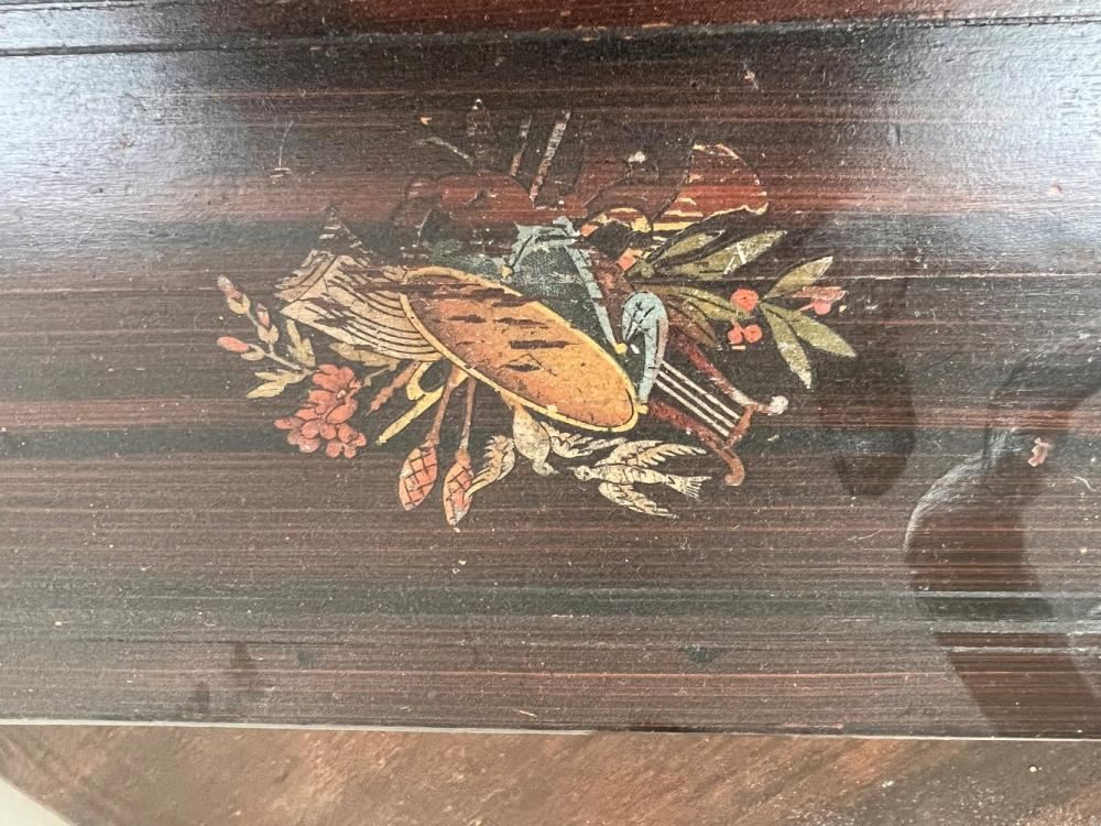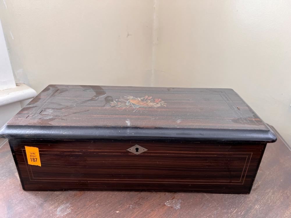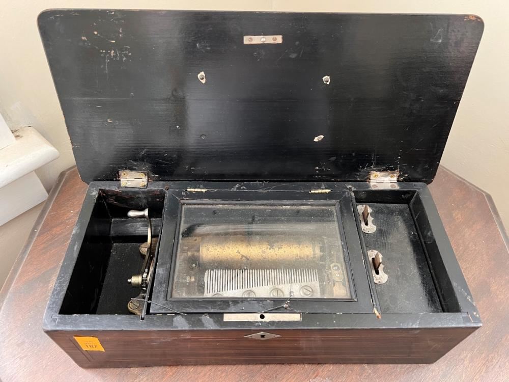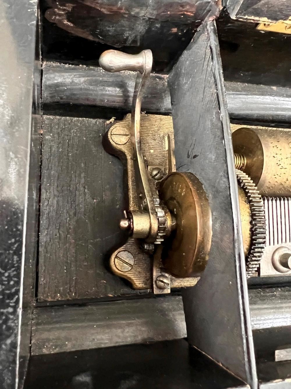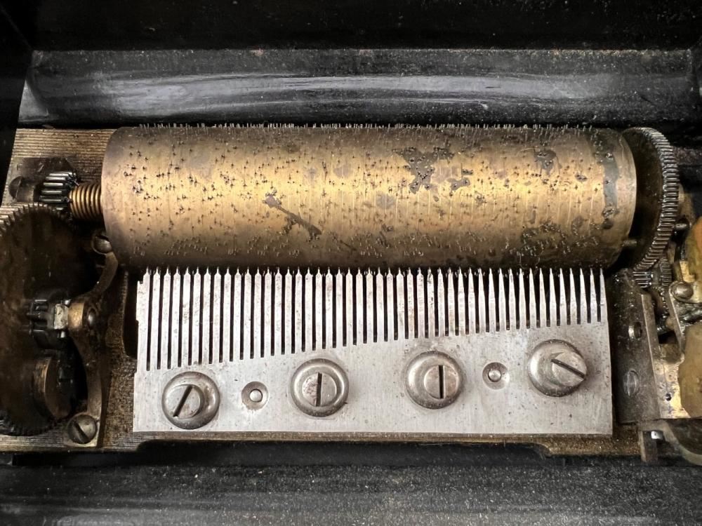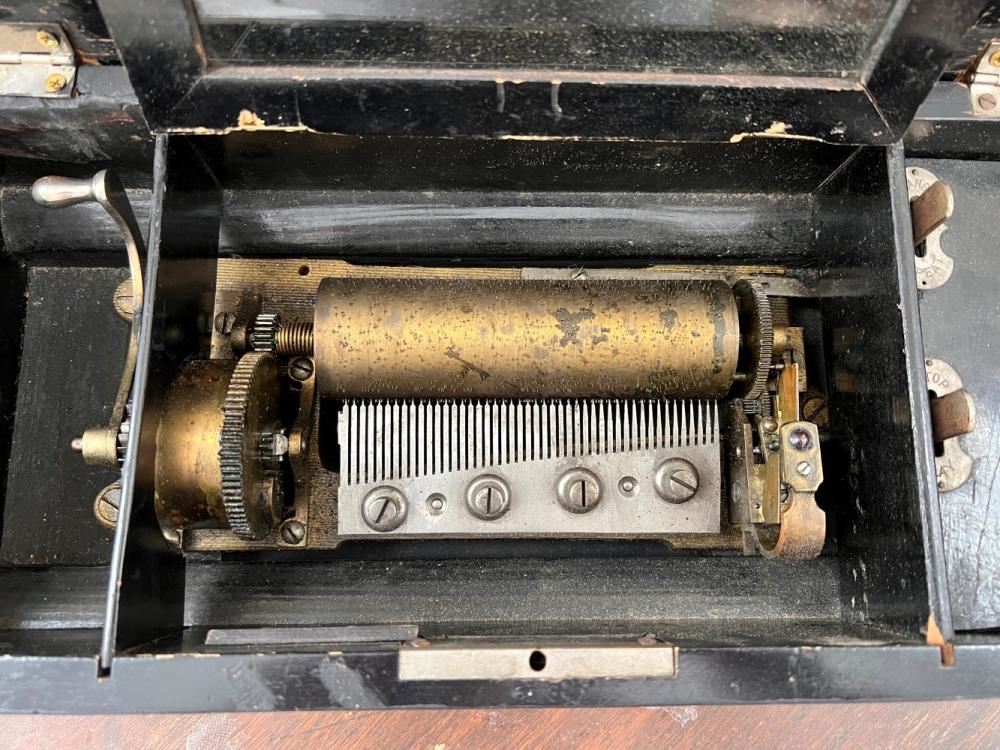French Music Box. 4 tune, crank music, all teeth in good condition. Working condition. Approx.16 inches long x 7.5 inches wide x 4 inches deep.