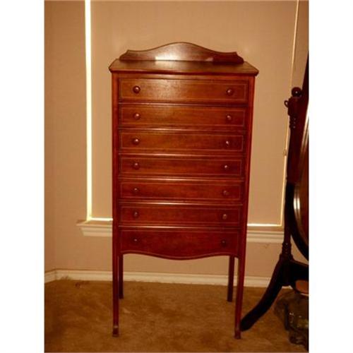 WHAT A FIND! Here is a beautiful antique music chest with a scroll-shaped backsplash on a rectangular top. The chest itself is bowed with 7 narrow drawers having simple turned wood pulls. This beauty stands on slightly cabriole front legs. The drawers and frame are outlined with a single band of stringing.