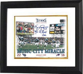 Steve Christie from the Buffalo Bills kicked off, and Tennessee Titans player Lorenzo Neal received. Neal handed the ball off to Titans tight end Frank Wycheck, who threw a lateral across the field to another Titans player, Kevin Dyson, who then ran down the sidelines for a 75-yard touchdown. The play was named "Home Run Throwback" by the Titans and was developed by Special Teams Coordinator Alan Lowry. The Titans ran the play regularly in practices during the regular season, though the practices usually involved Derrick Mason, who had been injured earlier in the game and was unavailable for the situation. Dyson, as one of the team's lead wide receivers, rarely practiced with the special teams unit and was largely unfamiliar with the layout of the play. Nevertheless, his execution of Lowry's vision was flawless and thus became the "Music City Miracle". This Music City Miracle 8x10 Photo is hand signed by Kevin Dyson with Music City Miracle 1/8/00 inscription. Private Signing October 24, 2012 in Nashville, TN. Certificate of Authenticity from Athlon Sports. Custom White Mat and Premium Black Frame as shown.