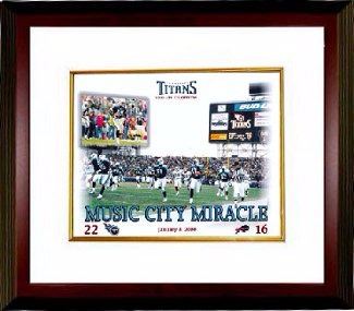 Steve Christie from the Buffalo Bills kicked off, and Tennessee Titans player Lorenzo Neal received. Neal handed the ball off to Titans tight end Frank Wycheck, who threw a lateral across the field to another Titans player, Kevin Dyson, who then ran down the sidelines for a 75-yard touchdown. The play was named "Home Run Throwback" by the Titans and was developed by Special Teams Coordinator Alan Lowry. The Titans ran the play regularly in practices during the regular season, though the practices usually involved Derrick Mason, who had been injured earlier in the game and was unavailable for the situation. Dyson, as one of the team's lead wide receivers, rarely practiced with the special teams unit and was largely unfamiliar with the layout of the play. Nevertheless, his execution of Lowry's vision was flawless and thus became the "Music City Miracle". This Music City Miracle 11x14 Photo is Custom Framed with White Mat and Mahogany Color Framed as shown.