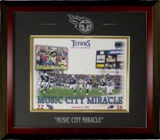 Steve Christie from the Buffalo Bills kicked off, and Tennessee Titans player Lorenzo Neal received. Neal handed the ball off to Titans tight end Frank Wycheck, who threw a lateral across the field to another Titans player, Kevin Dyson, who then ran down the sidelines for a 75-yard touchdown. The play was named "Home Run Throwback" by the Titans and was developed by Special Teams Coordinator Alan Lowry. The Titans ran the play regularly in practices during the regular season, though the practices usually involved Derrick Mason, who had been injured earlier in the game and was unavailable for the situation. Dyson, as one of the team's lead wide receivers, rarely practiced with the special teams unit and was largely unfamiliar with the layout of the play. Nevertheless, his execution of Lowry's vision was flawless and thus became the "Music City Miracle". This Music City Miracle 16x20 Photo is Custom Framed with the Titans logo and a Black Mat and Mahogany Color Framed as shown.