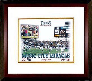 Steve Christie from the Buffalo Bills kicked off, and Tennessee Titans player Lorenzo Neal received. Neal handed the ball off to Titans tight end Frank Wycheck, who threw a lateral across the field to another Titans player, Kevin Dyson, who then ran down the sidelines for a 75-yard touchdown. The play was named "Home Run Throwback" by the Titans and was developed by Special Teams Coordinator Alan Lowry. The Titans ran the play regularly in practices during the regular season, though the practices usually involved Derrick Mason, who had been injured earlier in the game and was unavailable for the situation. Dyson, as one of the team's lead wide receivers, rarely practiced with the special teams unit and was largely unfamiliar with the layout of the play. Nevertheless, his execution of Lowry's vision was flawless and thus became the "Music City Miracle". This Music City Miracle 8x10 Photo is Custom Framed with White Mat and Mahogany Color Framed as shown.