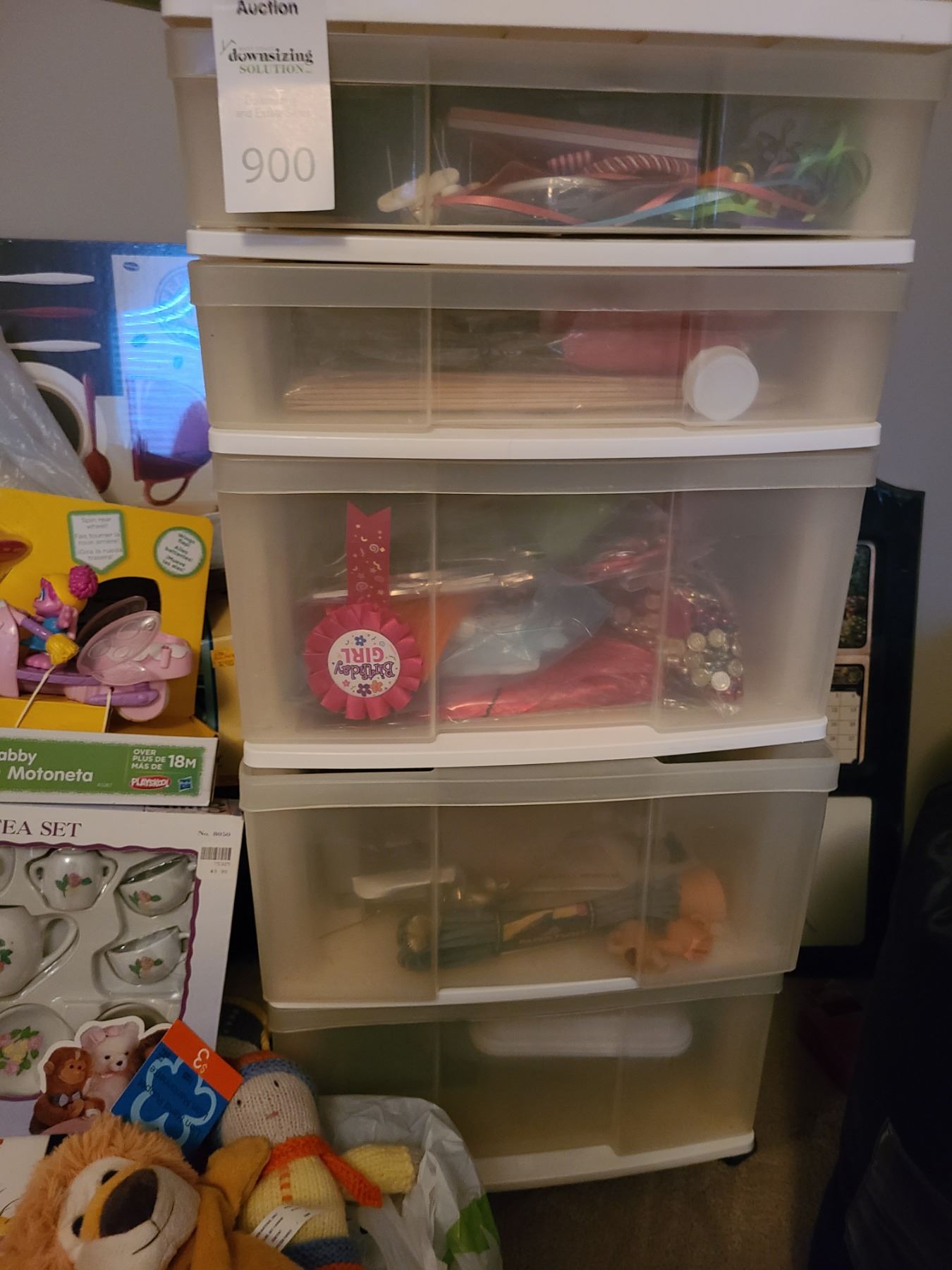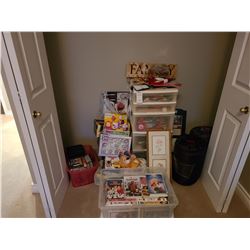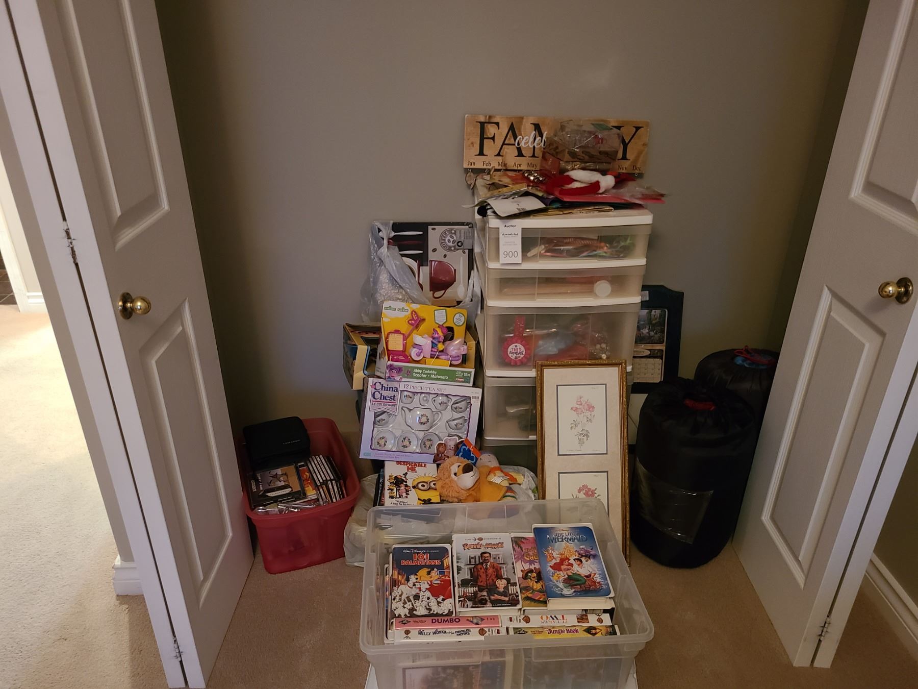 Lot includes VHS movies for children, music CDs, crafting supplies, small toys for children, and 2 sleeping bags. Bring packing material. Pickup 9 am.