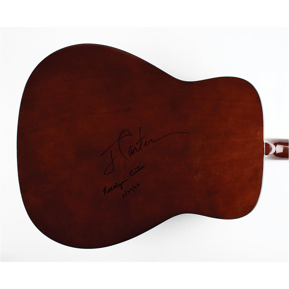 Impressive Yamaha acoustic guitar with a natural finish, signed on the body, pickguard, and sound hole interior in black felt tip by over 35 notable musicians, with the back of the guitar also signed by Jimmy and Rosalynn Carter. The signatures are listed alphabetically: Aerosmith (Steven Tyler and Joe Perry), Angie Aparo, Bon Jovi (Jon Bon Jovi (sound hole), Richie Sambora, and David Bryan), June Carter Cash, Johnny Colt, Elvis Costello, Creed, Bo Diddley, Justin Hayward of The Moody Blues, Don Henley, Elton John, Kid Rock, Jared Leto, Edwin McCain, Don McLean, Mike Mills of R.E.M., Willie Nelson, No Doubt (Gwen Stefani (pickguard) and Tony Kanal), Remy Zero (August Cinjun Tate and Cedric LeMoyne), Tony Rich, Darius Rucker, Rush (Geddy Lee, Neil Peart, and Alex Lifeson), Butch Walker, Ann and Nancy Wilson, and Yes (Jon Anderson, Chris Squire, and Steve Howe). The consignor notes that the Carter signatures were obtained during the Winter Weekend Retreat Auction held on February 23, 2003. In fine condition. Accompanied by a Kases gig bag.