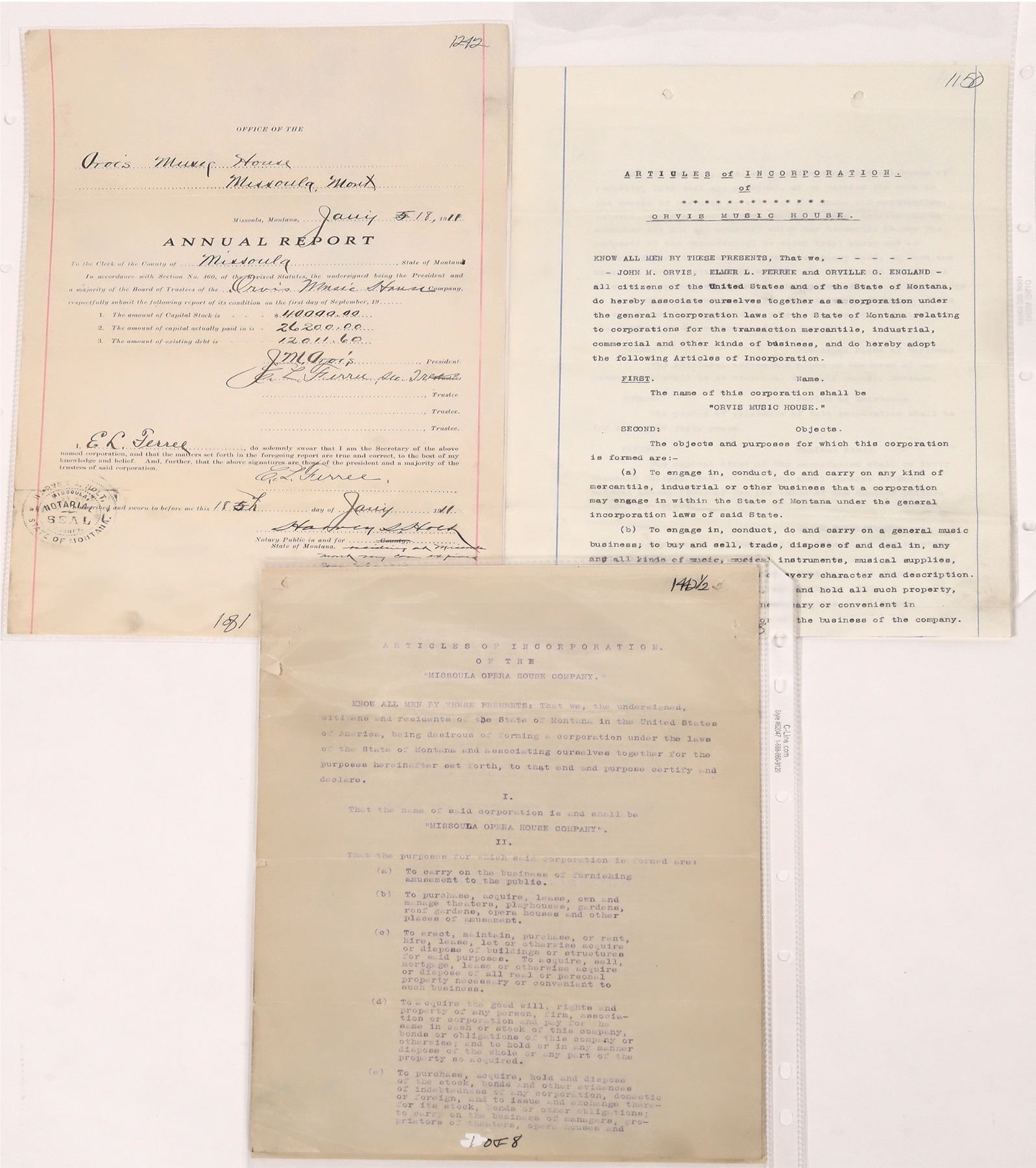 Articles of Incorporation and annual report from Orvis Music House c. 1910-11. Articles of incorporation Missoula Opera House 1912. Montana Missoula