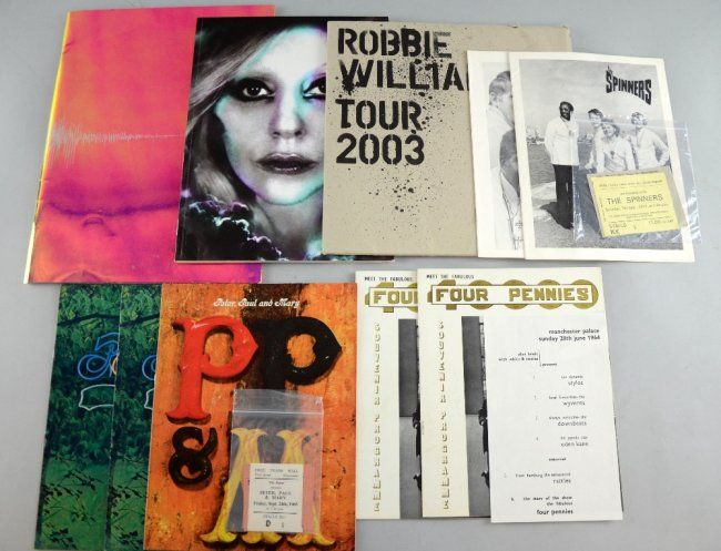 Music Programmes including The Spinners 1974 & 76 with ticket stubs, Peter, Paul & Mary 1965 & 68 with ticket stubs, Four Pennies 1964 x2, Kylie Fever 2002, Robbie Williams Tour 2003 & Lady Gaga Born This Way 2011