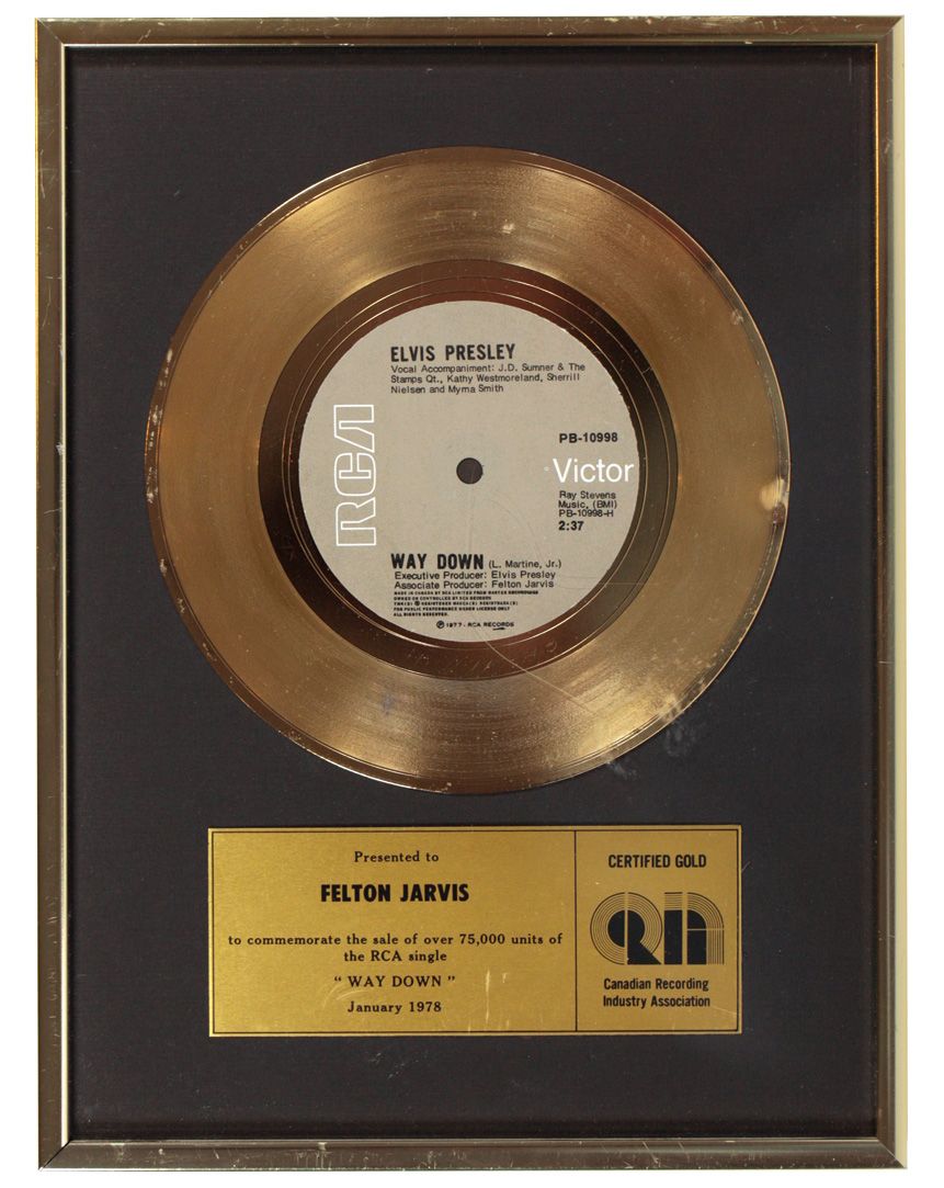 Music award, 'Way Down' by Elvis Presley presented by Canadian Recording Industry Association to associate producer Felton James, James worked w/Elvis for many years, Steve Pilchen collection, Exc cond w/minor surface wear, 12.25"H x 9.25"W.