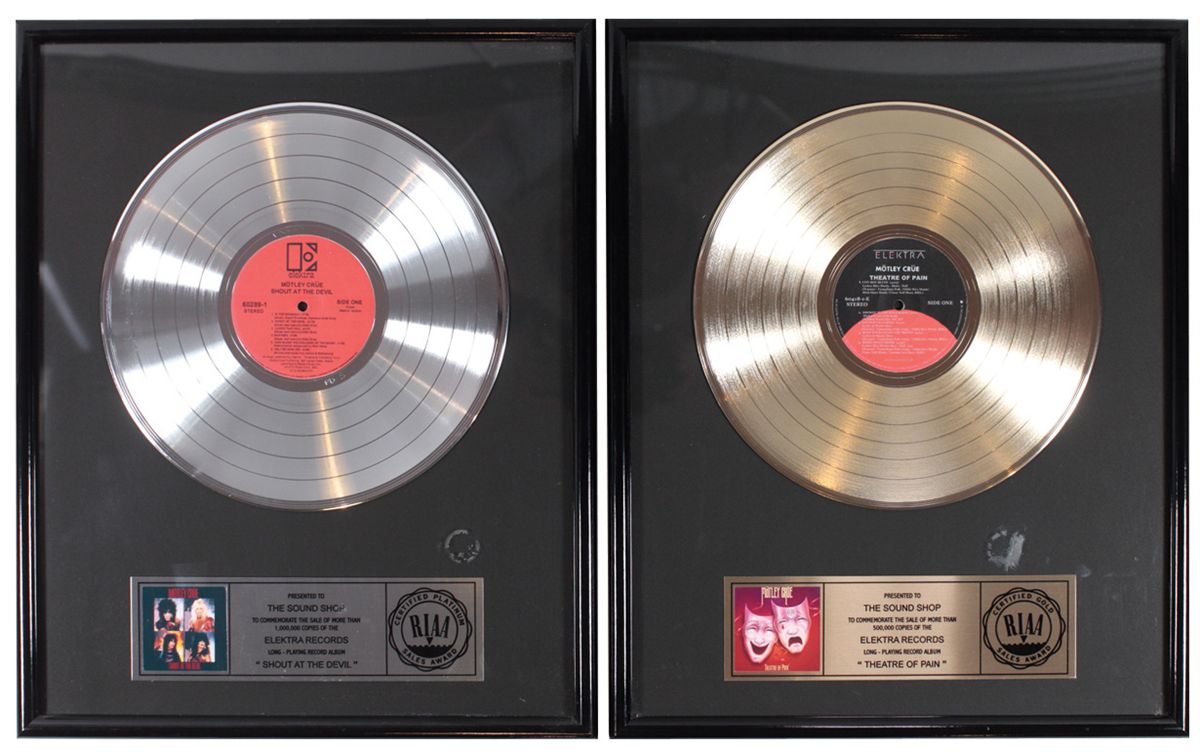 Music awards (2), "Theater of Pain & Shout at the Devil" Platinum & Gold RIAA awards presented to the Sound Shop, Exc cond, 21"H x 17"W.