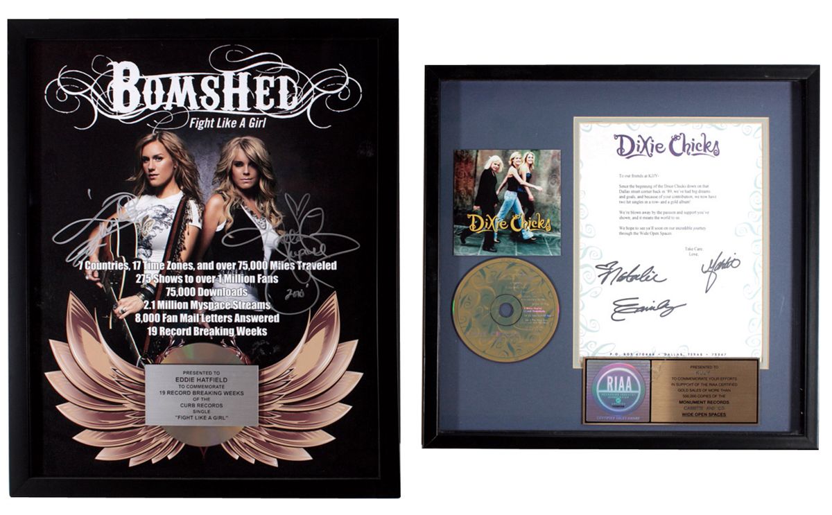 Music awards (3), Wide Open Spaces by Dixie Chicks 2 RIAA awards presented to radio station KJJY for sales over 4 million & sales over 500,000 w/signed letter, Fight Like a Girl by Bomshel award presented to Eddie Hatfield for 19 record-breaking weeks, Steve Pilchen Collection, Exc cond, up to 24"H x 32"W.