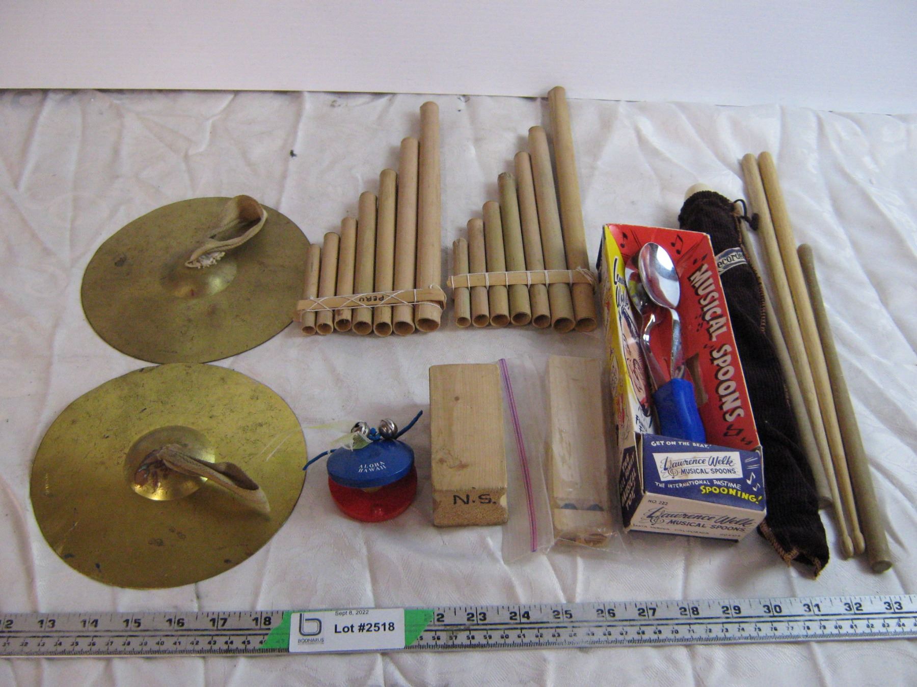Music instruments - 2 pan flutes, drumsticks, cymbals(2), Wooden block/whistle, Castanets, Musical Spoons Z Recorder