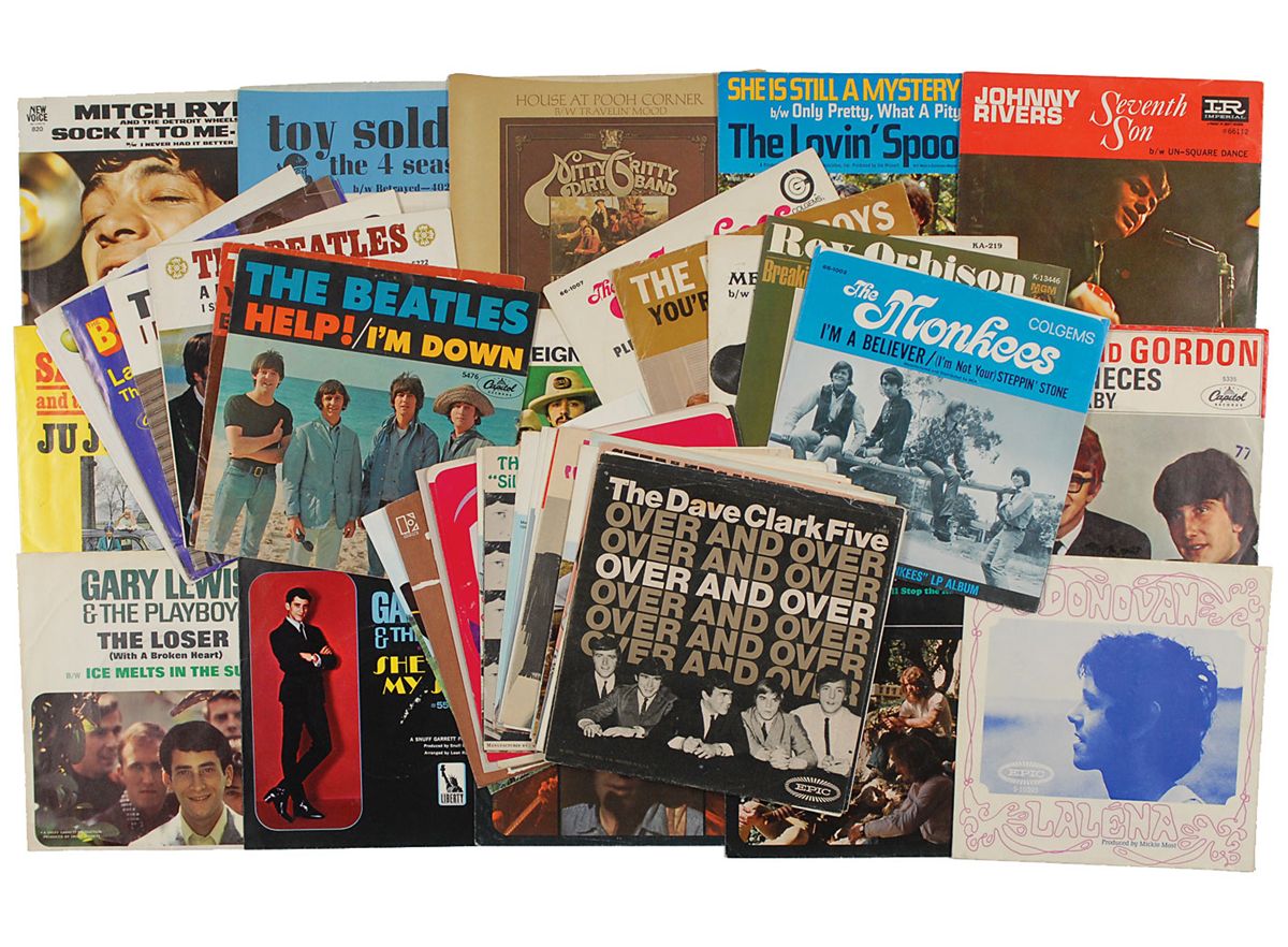 Collection of 44 unsigned sleeves for 45 rpm records, featuring many of the greatest bands of the 1960s and 1970s, including: Beatles, Creedence Clearwater Revival, Beach Boys, Monkees, The Lovin’ Spoonful, Manfred Mann, Stealers Wheel, Dave Clark Five, Bread, and others. In overall very good to fine condition. None of the records are included.
