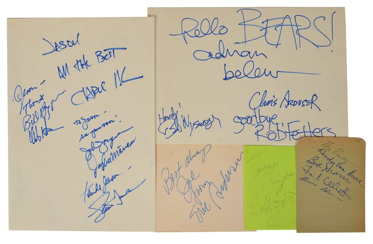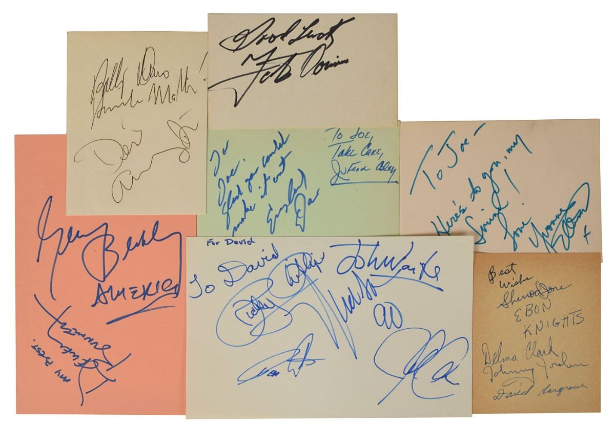 Collection of twelve sheets and album pages signed by groups and musicians from a variety of genres, ranging from the 1950s through 1980s, including: The Encores; Fats Domino; The Ebon Knights; Dino, Desi & Billy; Boyce and Hart; Eric Anderson; America; England Dan & John Ford Coley; Yvonne Elliman; The Desert Rose Band; The Bears; and Bad English. In overall fine condition.