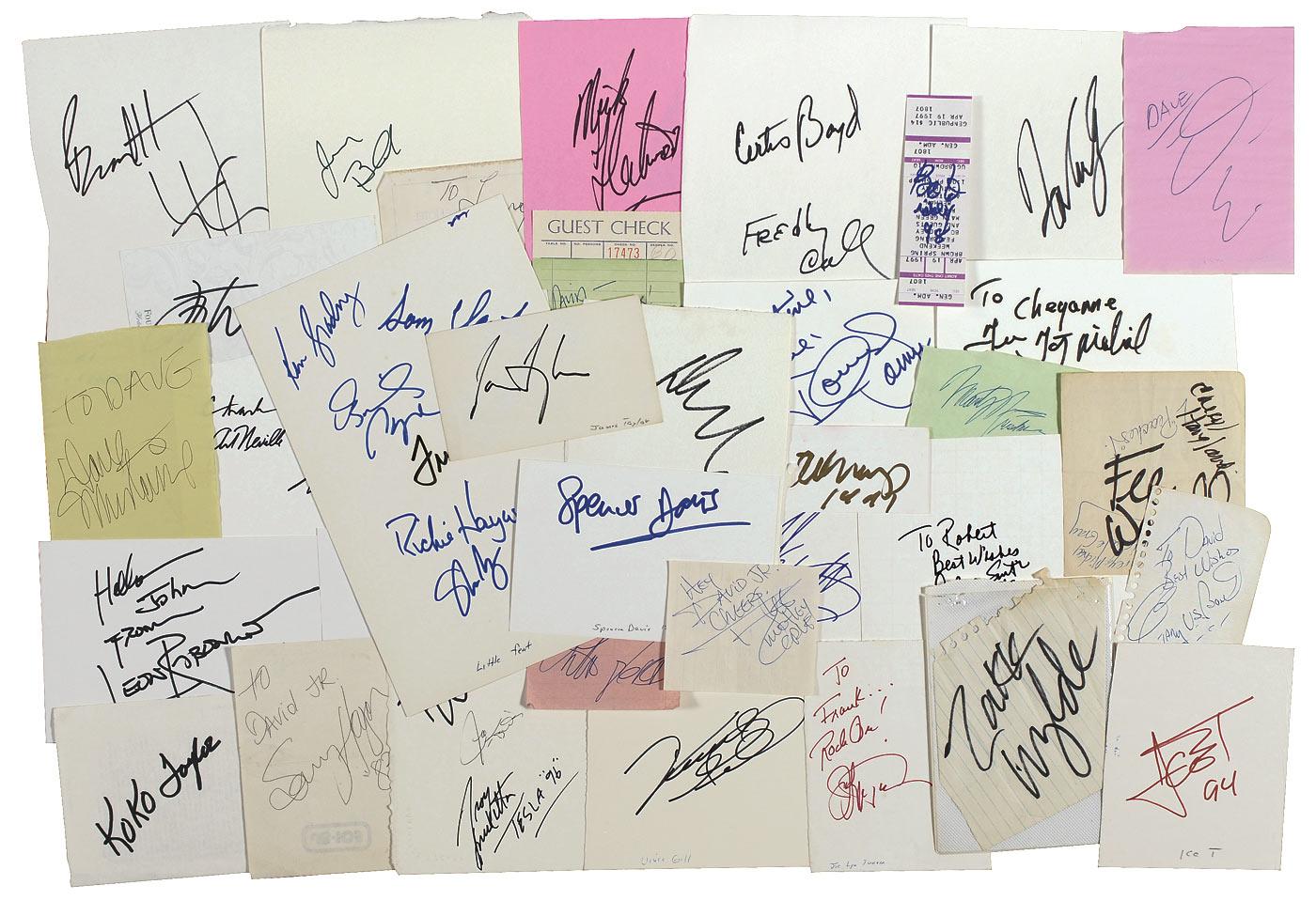 Eclectic collection of 59 ink and felt tip signatures of various musicians on various size cards, sheets, slips, and tickets, with a few adding brief inscriptions. Signers include: Geddy Lee, David Clayton Thomas, Dave Navaro, Spencer Davis, Fergie Fredrickson, Leslie Gore, James Taylor, Ice T., John Mellencamp, Ben E. King, David Jones, David Crosby, Al Stewart, Leon Redbone, Trinie Lopez, Bo Diddley, The Neville Brothers, Tommy James, Taj Mahal, The Tubes, Lita Ford, Slaughter, Koko Taylor, Zakk Wylde, Joe Lynn Turner, Vince Gill, Tesla, Huey Lewis and the News, Sammy Hagar, Megadeath, Gary U. S. Bonds, Mick Fleetwood, Jim Farrar, Jay Black, B. B. King, John Waite, Steve Vai, Little Joe Cook, Skid Row, Carmine Appice, Tommy Lee, Dusty Hill, Frank Beard, Ian Anderson, Little Feat, Rick Savage, Mike Rutherford and Paul Young, Bela Fleck and the Flecktones, Beck, Tori Amos, and Suzanne Vega. In very good overall condition. RRAuction COA.