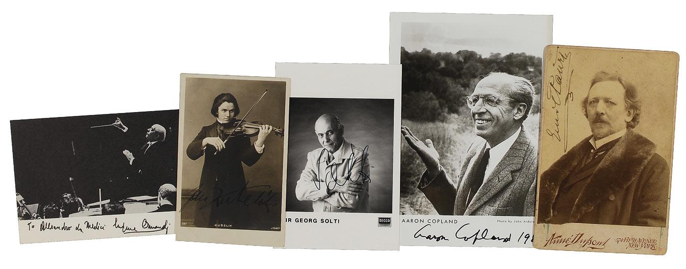 Five signed photos, ranging in size from 3.5 x 5.5 up to 5.25 x 7.5, each signed in ink or felt tip by the respective musician or composer pictured. Signers are: Emil Paur, on an original 4.25 x 6.5 Aime Dupont cabinet photo, Aaron Copland, Georg Solti, Jan Kubelik, and Eugene Ormandy (ins). In fine overall condition, with cabinet photo rating very good. Provenance: The Barry Hoffman Collection.