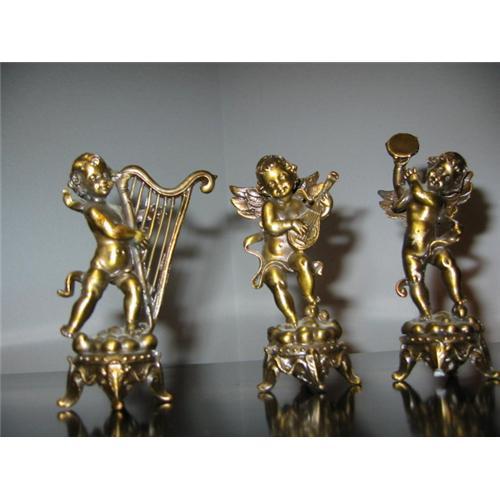 </font></strong>These 3 decorative angels are made of dark brass and in different musical position. They each play a musical instrument. Figurines are highly detailed and are not in perfect condition. One of them has a missing middle leg. Figurine on the left is missing wing and is playing harp. Images are shown). These brass figurines are gorgious and measuring 4.5 inch tall. They are decorative and metal heavy. </font>