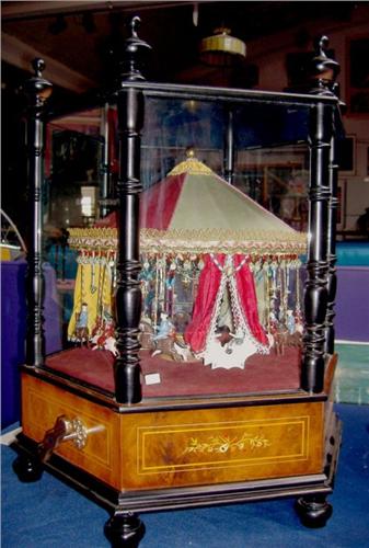 Boite à musique «Carrousel» de Bornand Frères à Ste Croix avec monnayeur. En mettant l'argent, le carrousel se tourne et les deux enfants dansent( Le carrousel et une partie de la boite ont été restaurés comme l'original). Dimensions 61cm x 55cm. Epoque env. 1880