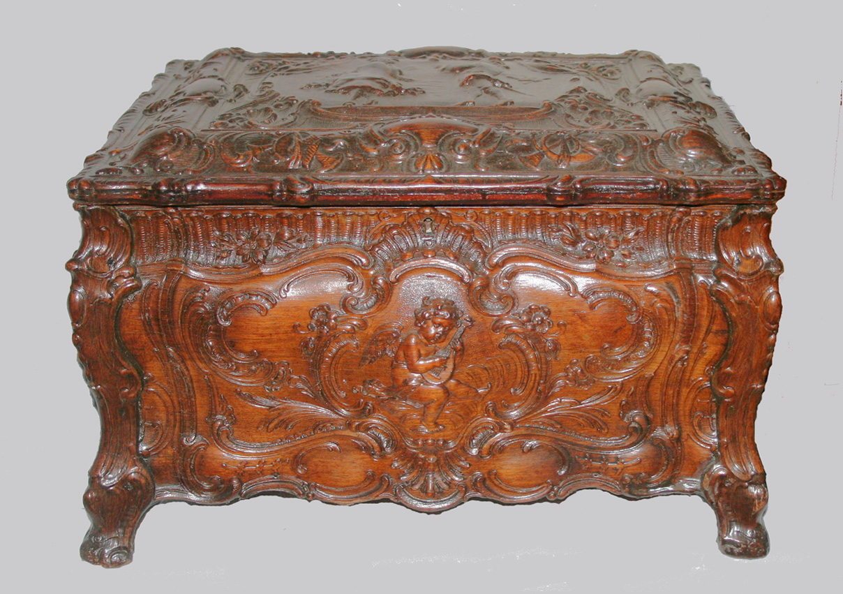 Ornately carved musical box case suitable for a disc mechanism. Depicted on the top are a man and woman in period dress dancing. All surfaces are ornately carved. Hinges are not original to the box. Overall dimensions approx. 18" x 15" x 10.5
