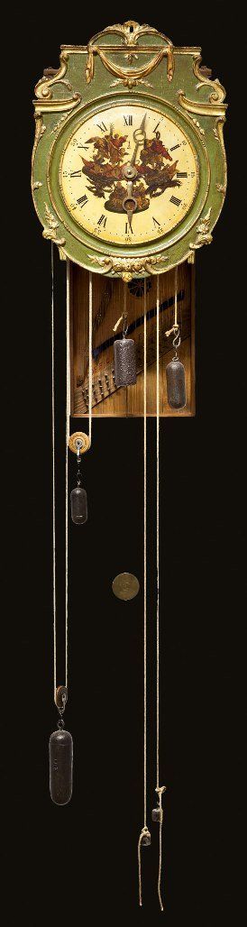Rare musical dulcimer clock from the Black Forest. The 15 key musical movement plays one tune on the hour by little hammers hitting the strings. Museum's quality. 53 x 27 x 86cm. Manufacturer unknown, probably Black Forest, Germany, circa 1840.